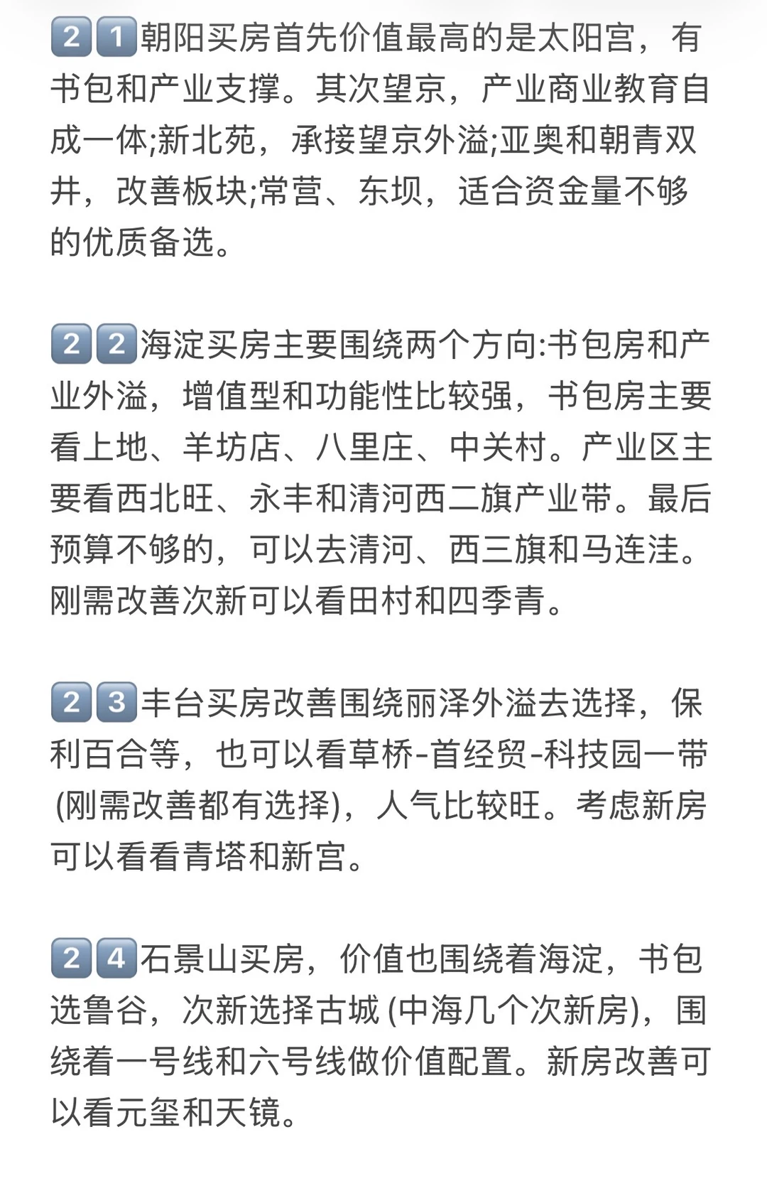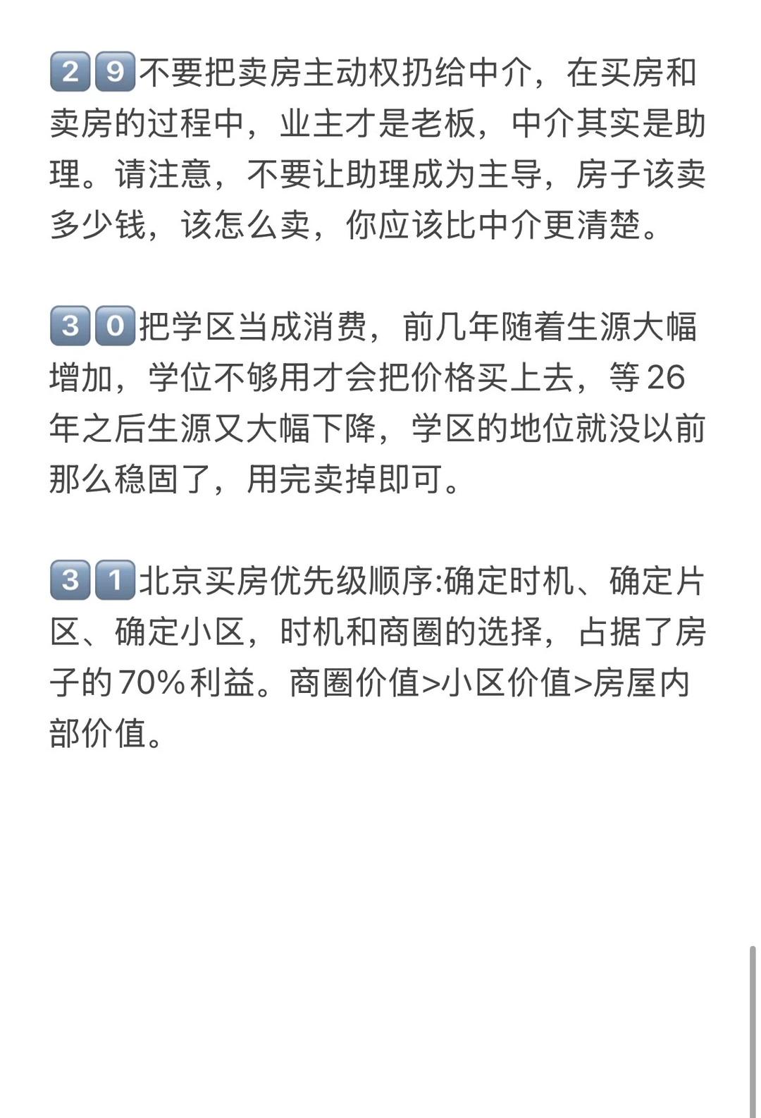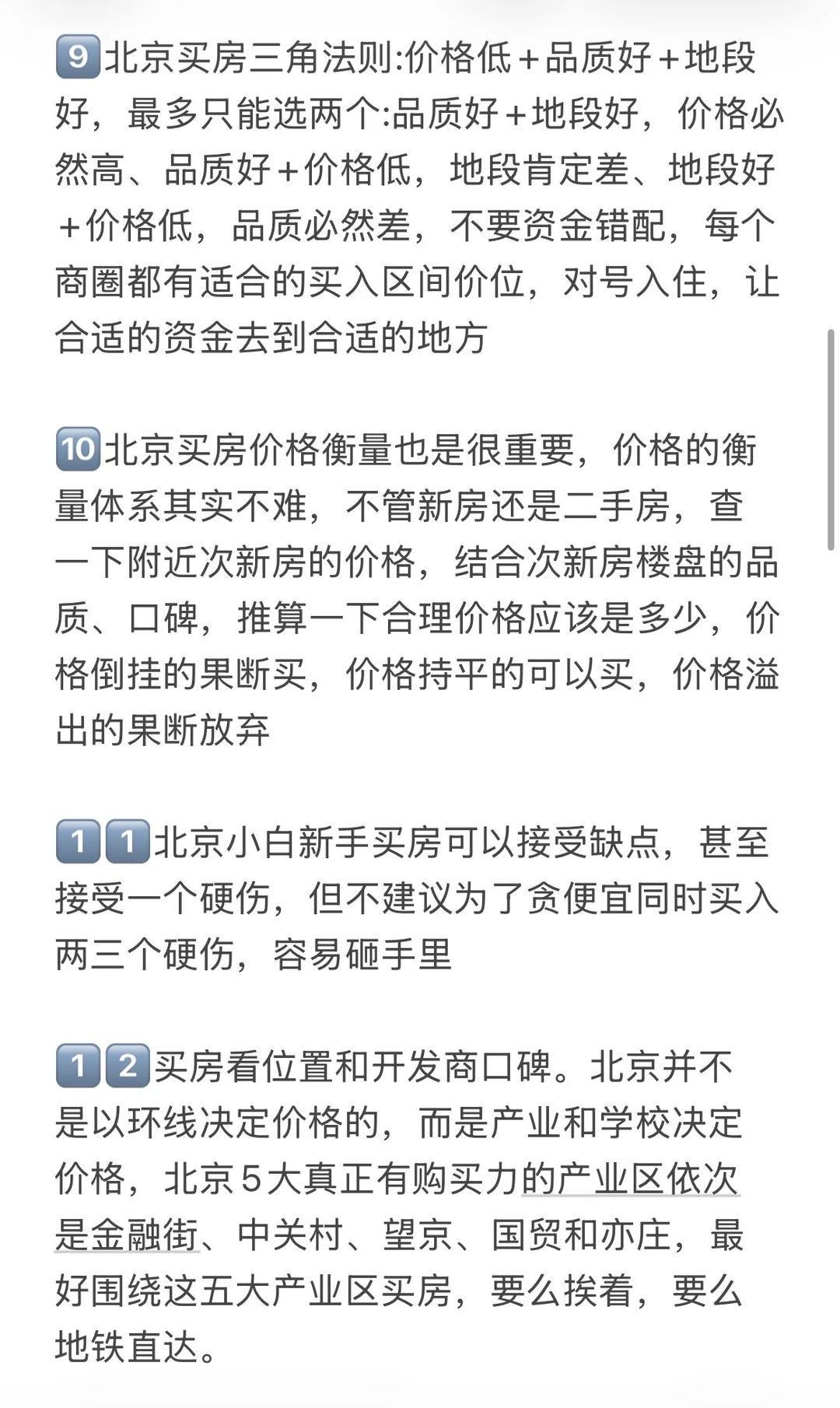 1️⃣北京买房要关注地铁规划,一定要在意地铁,通勤方便很重要!刚需买房首选的通勤方式就是地铁,地铁是必需的,北京是TOD式发展的模式,交通引领城市。地铁开通的前一天和地铁开通的第二天,立马是两个价格 2️⃣三居优于两居优于一居,从房子的流动性而言,同样预算下三居两居比一居更受欢迎!居室排名原则:三居>两居>四居>一居>五居,这个原则下,尽量上两三居,小区的涨幅预期,优先于居室。 3️⃣朝向排名大体上是:南北、全南、东南、南、东、东、、北。一般来说全南的房子比东西的房子卖得好一些,朝北朝西的房子流动性不行,住着也不会很舒服,都不太合适 4️⃣北京的换房周期一般是7年左右,买房的时候一定要想到未来置换时容不容易出手。买房前一定要梳理好自己的主要需求是什么(刚需上、改善置换、学区、TZ)不同需求有不同的选房逻辑 5️⃣选房时,先关注商圈,然后选择小区,最后看小区内部和具体房源,板块>小区>房源,这是你选房时应参考的底层逻辑。商圈价值>小区价值>房屋内部价值 6️⃣考虑保值流通,没有电梯的顶层老破小一律不要考虑。没有学区要求一定别碰老破小!未来只有带顶级学区属性的老破小有可能跟上大盘 7️⃣左滑图片,查看更多