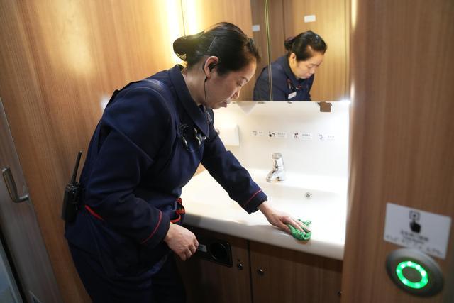 看似简单的工作,却始终坚持着最高的标准:卫生间一客一清,抽纸、卷纸等消耗用品及时补充,地面卫生随脏随扫。座椅缝隙、洗手台面、座椅扶手、过道地面,哪里有脏污,哪里就有他们忙碌的身影。“这三节车厢就是我的一亩三分地,我得把它看好了!”童爱春说。