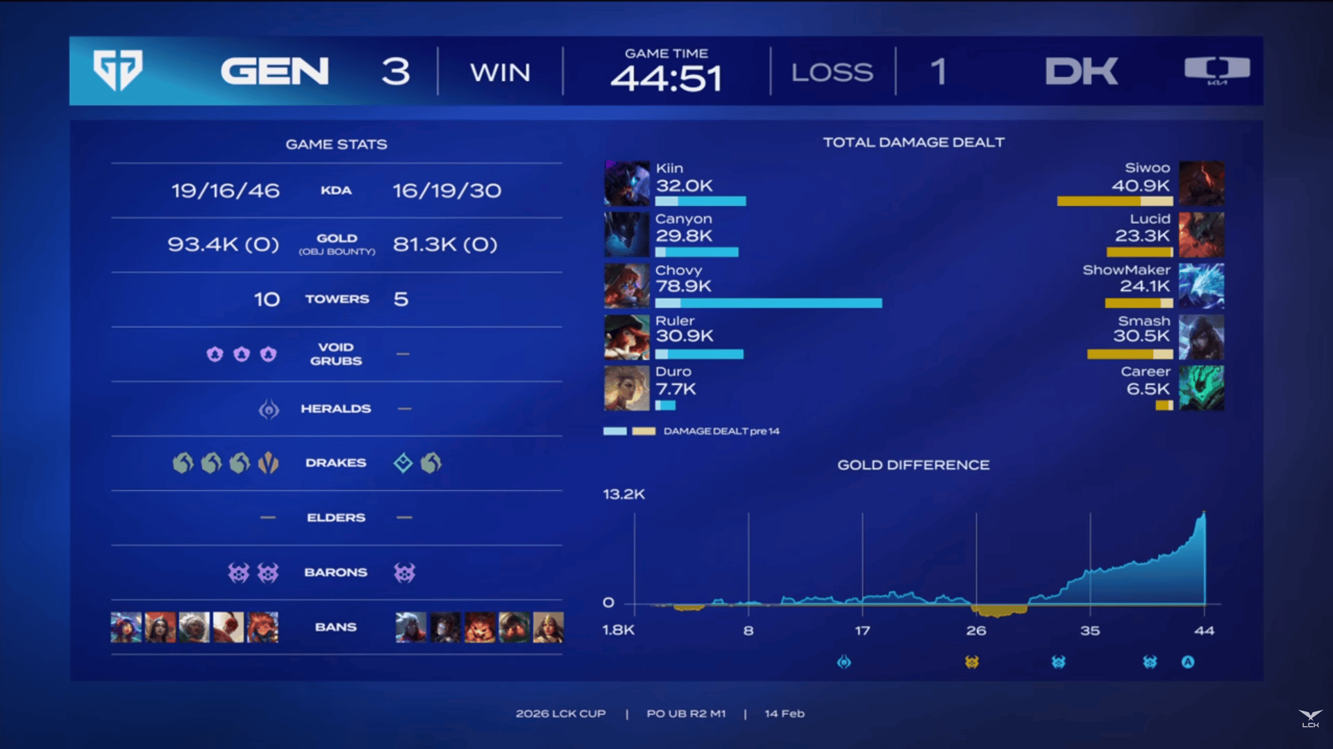 虎扑02月14日讯在刚刚结束的LCK杯淘汰赛的比赛中,GEN以3-1击败DK。而在第四局比赛中Chovy阿萝拉全场打出78.9K的输出,和他对位的ShowMaker冰鸟仅打出24.1K的输出。Chovy的输出高达ShowMaker的三倍以上,