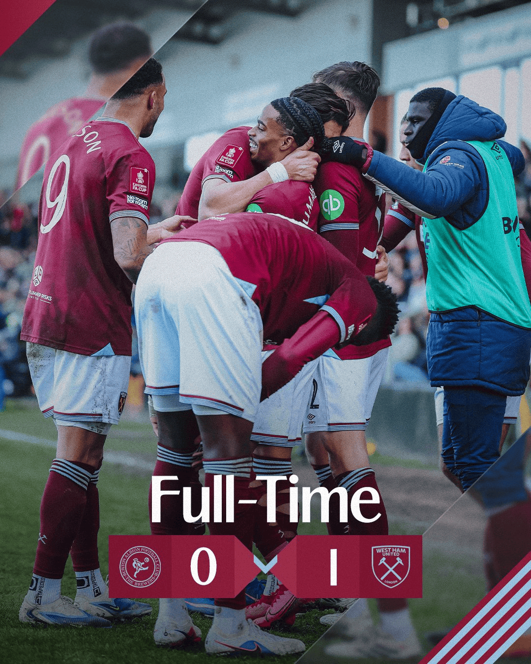 虎扑02月14日讯在刚刚结束的一场英格兰足总杯的第四轮比赛中,西汉姆联在客场1-0击败了英甲球队伯顿,晋级到本赛季足总杯的16强中。