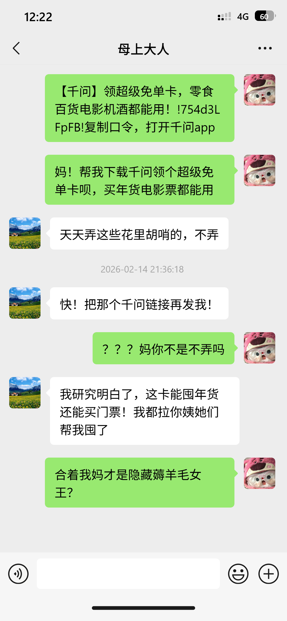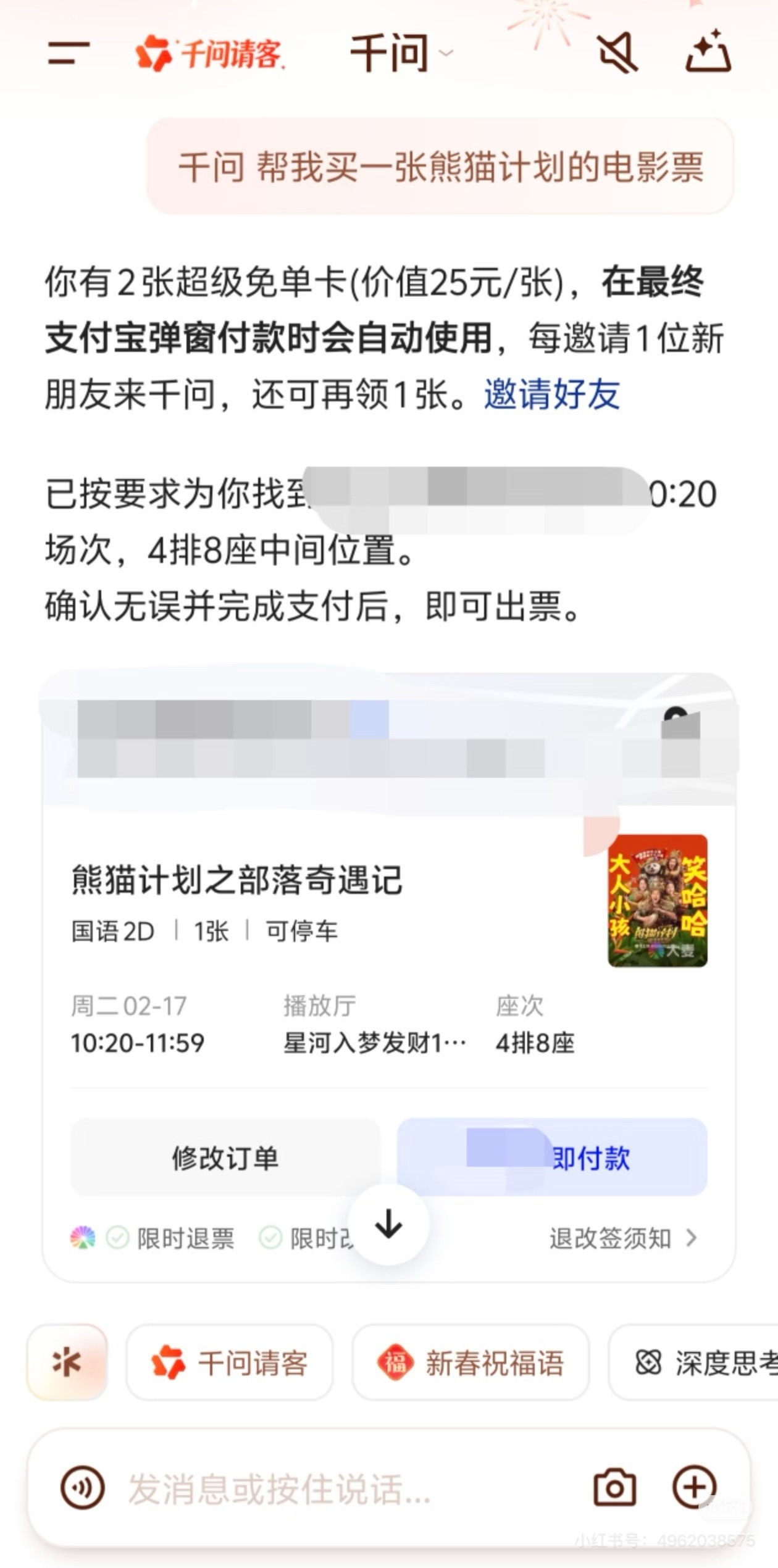 情人节发现男朋友联系高中女同学 算什么,我老公直接家族群发!美其名曰:“给咱家囤点‘生活幸福券’!” 现在家里买菜、看电影、假期周边踏青,第一反应都是:“千问卡用了吗?” 千问超级免单卡能买年货能买票从风花雪月到柴米油盐,千问超级免单卡的实惠,就是咱们小家稳稳的幸福感和规划感。千问超级免单卡再加3天