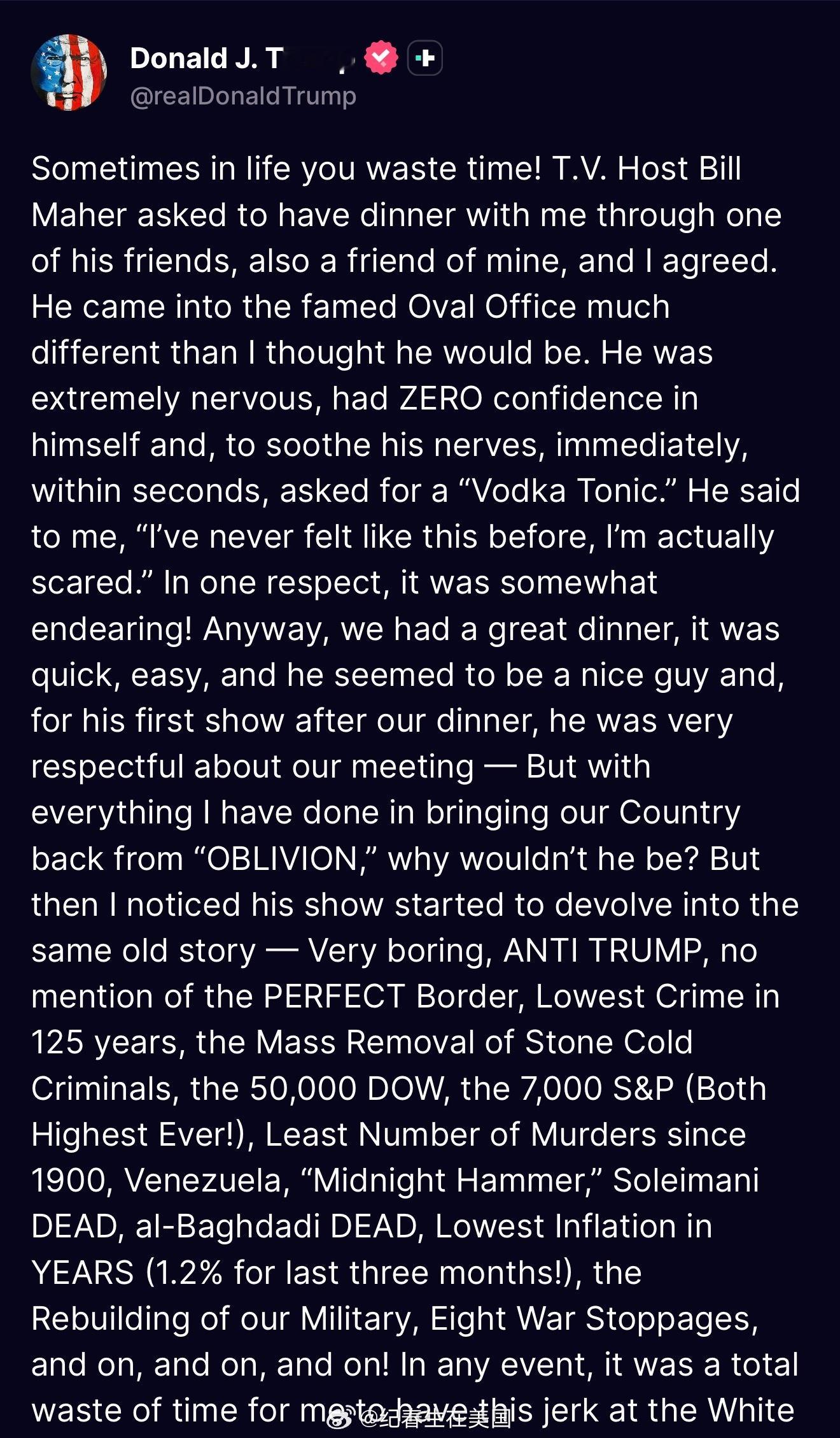 可没过多久,我就发现他的节目又变回老一套——无聊透顶,反川普。完全不提所谓“完美的边境”、125年来最低犯罪率、大规模驱逐铁面无情的罪犯、道指5万点、标普7000点(全都创历史新高!)、1900年以来最低谋杀率、委内瑞拉、“午夜重锤行动”、Soleimani被击毙、al-Baghdadi被击毙、近几年最低通胀(过去三个月只有1.2%!)、重建军队、八场战争停火……说不完!