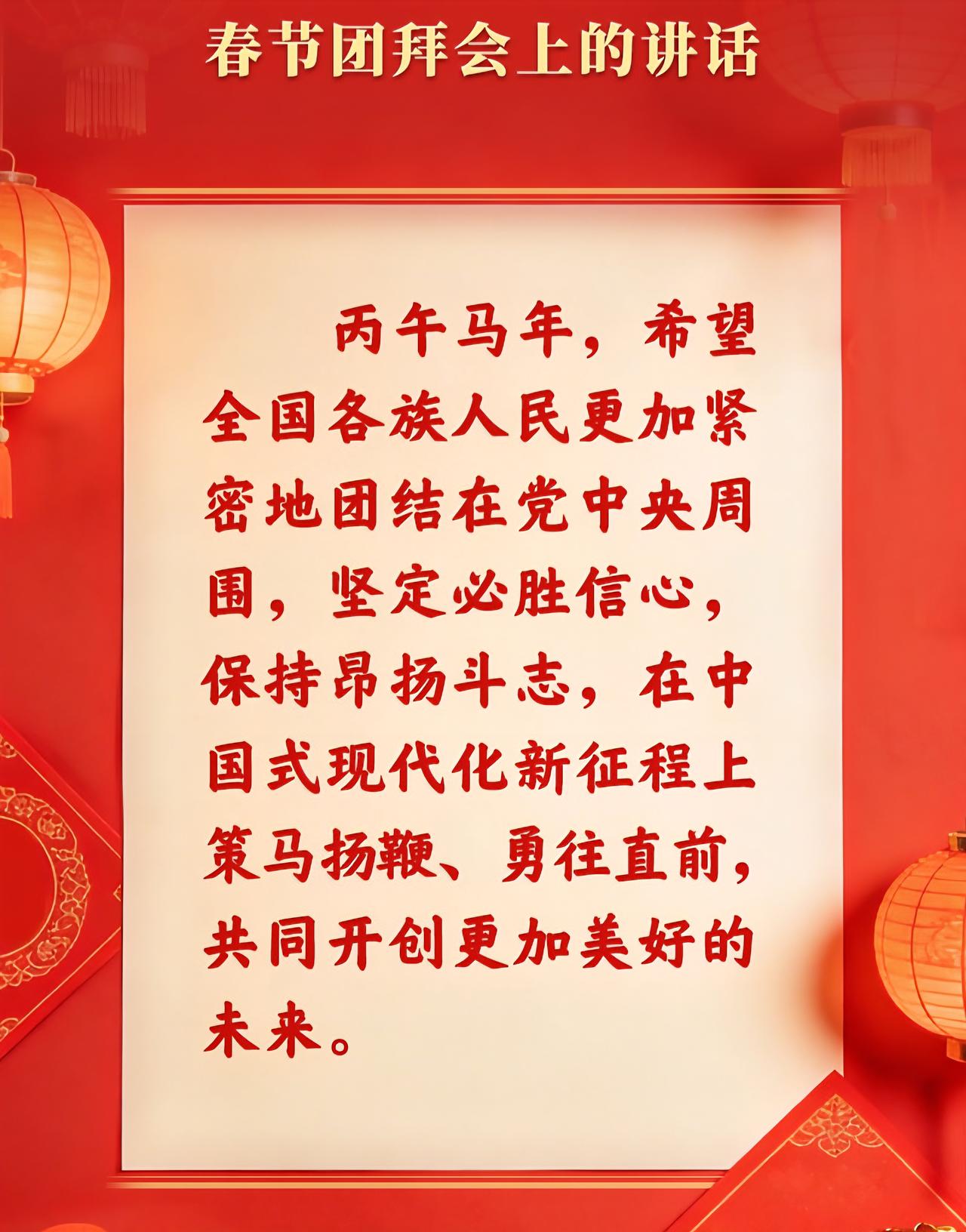 《香港高Sir•高能•热点词》 2025.02.15 热点词:领导人春节团拜会讲话振奋人心 共同努力开创「十五五」辉煌开局 中共中央、国务院14日在人民大会堂举行2026年春节团拜会。领导人发表讲话,代表党中央和国务院,向全国各族人民,向香港特别行政区同胞、澳门特别行政区同胞、台湾同胞和海外侨胞拜年。他指出,2026年是中国共产党成立105周年,是「十五五」开局之年。我们要坚持以新时代中国特色社会主义思想为指导,深入贯彻党的二十大和二十届历次全会精神,认真落实四中全会部署,坚持稳中求进工作总基调,完整准确全面贯彻新发展理念,加快构建新发展格局,着力推动高质量发展,保持社会和谐稳定,持之以恆推进全面从严治党,努力实现「十五五」良好开局。 高SIR:在丙午马年春节即将到来之际,中共中央、国务院举行春节团拜会,领导人发表了振奋人心的讲话。这篇讲话不仅温暖了海内外中华儿女的心田,更为国家在新的历史起点上描绘了宏伟蓝图。讲话全面回顾了乙巳蛇年极不平凡的奋斗历程,展现了中国式现代化坚实前行的步伐,发出了策马扬鞭、努力实现「十五五」良好开局的时代强音。回望过去的一年,面对複杂多变的国际国内形势,在党中央坚强领导下,全国上下迎难而上,推动党和国家事业取得新进展。「十四五」规划的圆满收官,标誌着我国综合国力跃上了新台阶。从宏观政策的积极有为到产业体系的现代化建设,从民主法治的深化到生态文明的进步,每一项成就都显得份量十足、沉甸甸。特别是在粤港澳三地联合举办第十五届全国运动会等重大活动,进一步凝聚了人心,彰显了制度优势。正如领导人所指出的,这些成就令人鼓舞,奋斗增添信心,展现出中国经济强大的韧性与活力。展望二〇二六年,这是中国共产党成立105周年,更是「十五五」规划的开局之年。领导人在讲话中强调,要坚持稳中求进工作总基调,完整准确全面贯彻新发展理念。开局关係全局,起步决定后程。做好「十五五」开局工作,对于高质量发展与社会和谐稳定至关重要。这需要我们保持战略定力,一步一个脚印扎实推进,积小胜为大胜。讲话中透露出的务实与坚定,为全社会注入了强大的确定性。最令人动容的是领导人始终强调的「人民至上」情怀。讲话明确指出,党为人民而生、因人民而兴,一切工作都是为了人民的幸福。这种对人民福祉的深切关怀,是创造经得起历史检验实绩的根本动力。在马年这个象徵刚健雄壮、自强不息的年份里,领导人号召全国人民更加紧密地团结在党中央周围,在大地春回之际策马扬鞭。高SIR坚信,在领导人讲话精神的指引下,只要坚定必胜信心,保持昂扬斗志,中国式现代化这艘巨轮必将行稳致远。让我们共同努力,开创「十五五」的辉煌开局,为开创更加美好的未来勇往直前。 2026春节团拜会在中国式现代化新征程上策马扬鞭