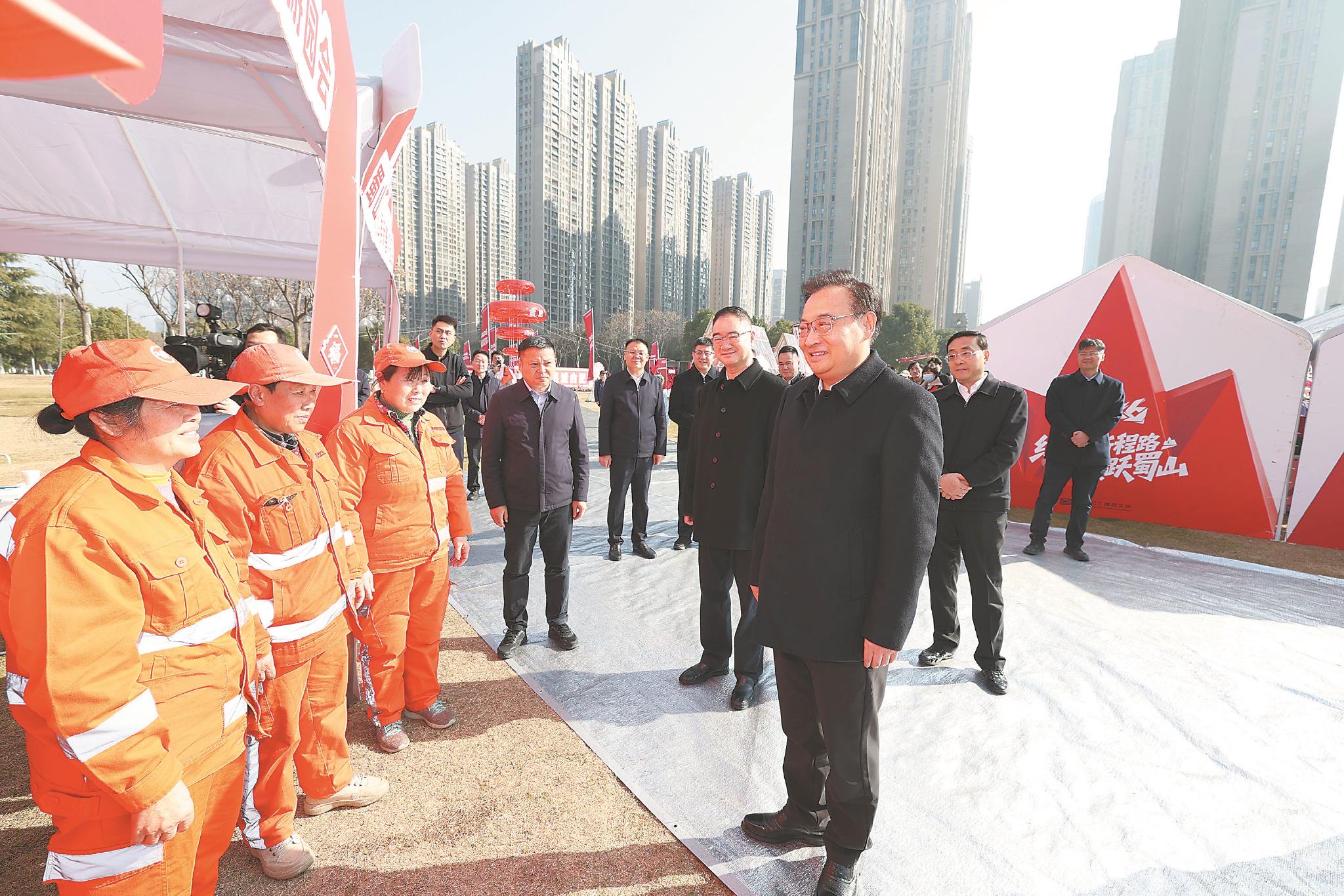 2月14日上午,省委书记梁言顺、省长王清宪在合肥市蜀山区绿轴公园,向在这里值守的环卫工人表示慰问。本报记者杨竹许昊摄