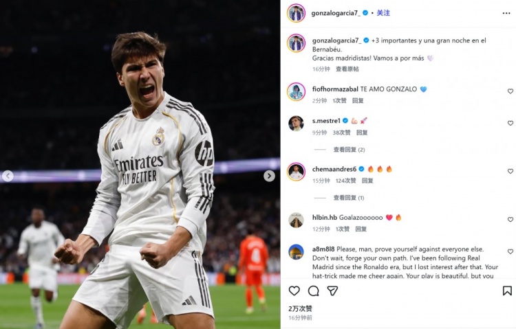 贡萨洛也在赛后通过社媒晒出自己的庆祝照,并配文:“再添关键3分,又一个精彩绝伦的伯纳乌之夜!感谢皇马球迷!让我们继续前进!”