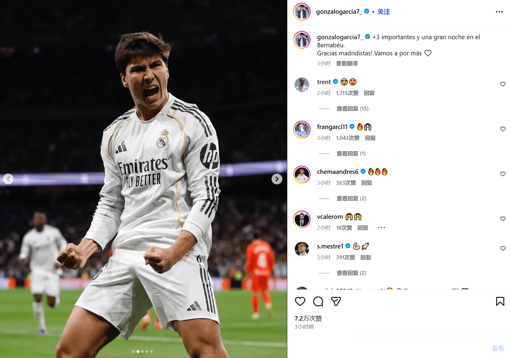 赛后,贡萨洛更新了Instagram:收获重要的三分,在伯纳乌球场度过的美妙夜晚,感谢皇马的支持者们,让我们继续奋进!