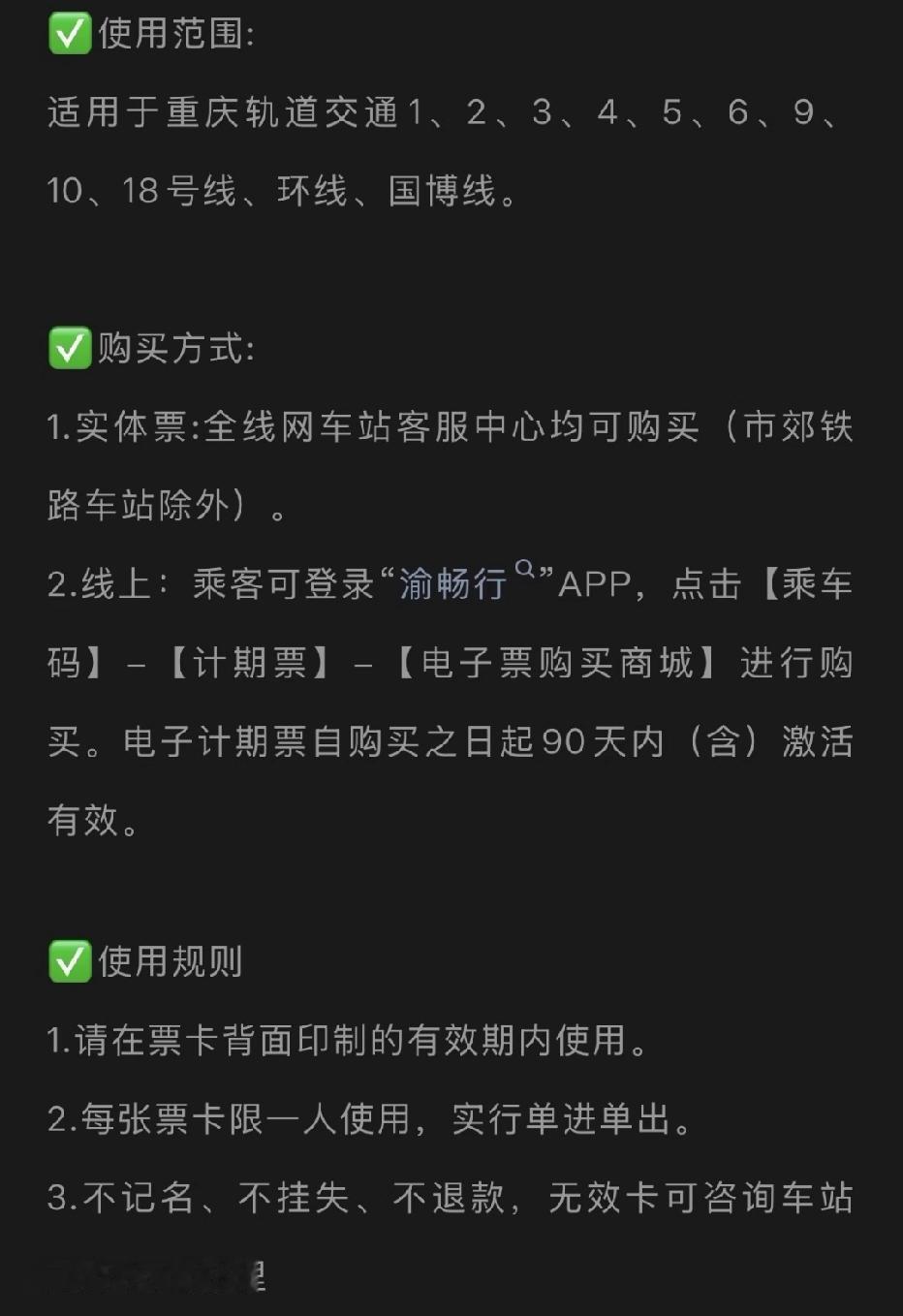 2026年2月10日起,重庆轨道交通推出一日票、三日票、五日票三种计期票,为市民和游客带来了更灵活、更具性价比的出行新选择! 一日票售价18元,激活后24小时内可无限次乘坐; 三日票45元,折合下来每天仅需15元,激活后72小时有效; 五日票70元,日均成本低至14元,激活后120小时内畅行无忧。 适用范围也十分广泛,计期票可通行于重庆轨道交通1、2、3、4、5、6、9、10、18号线,以及环线、国博线,基本覆盖了主城区核心景点和交通枢纽,不管是去洪崖洞、解放碑打卡,还是前往重庆北站、江北机场换乘,都能一票通达。 你认为这样的票价划算吗?