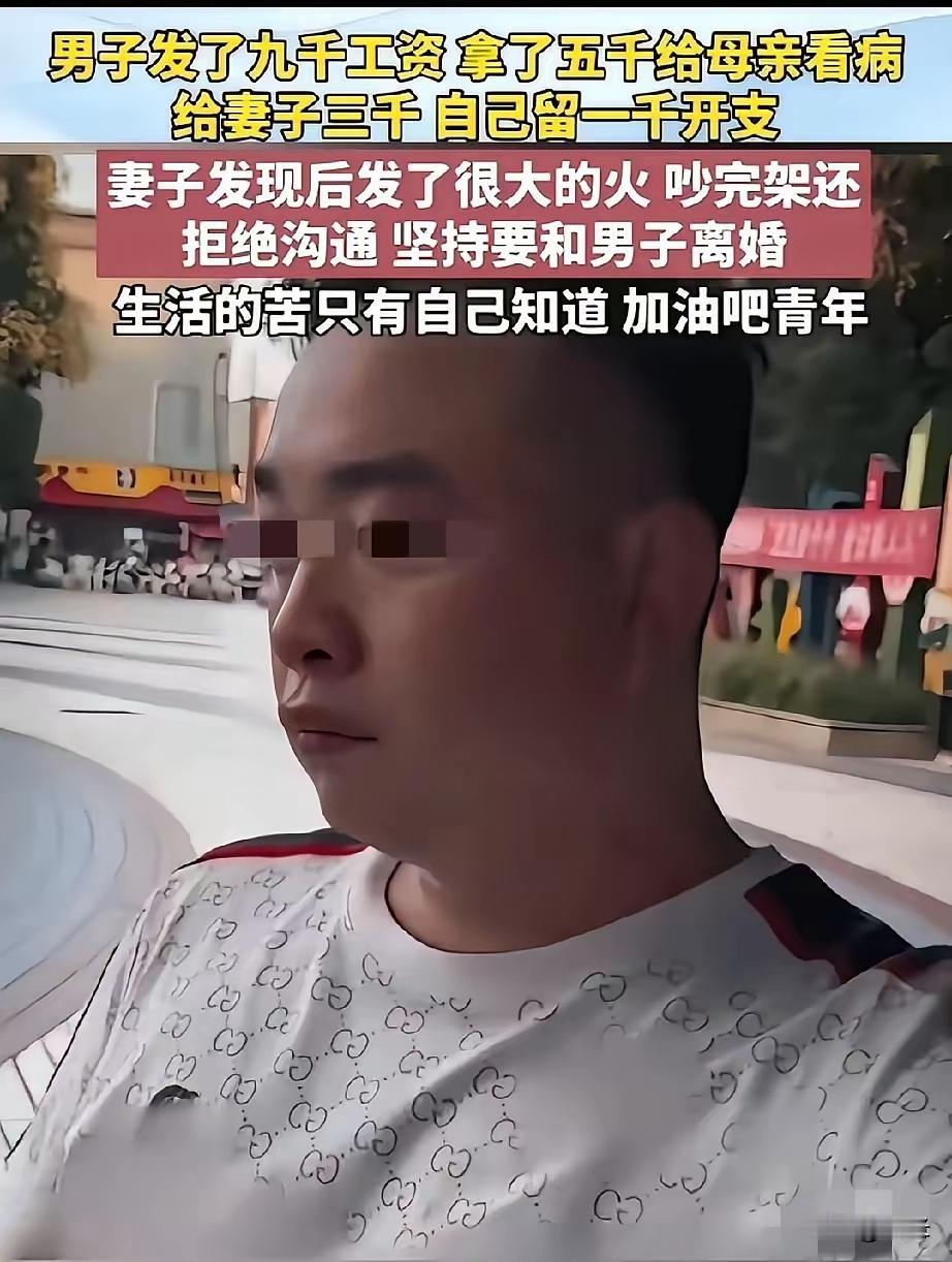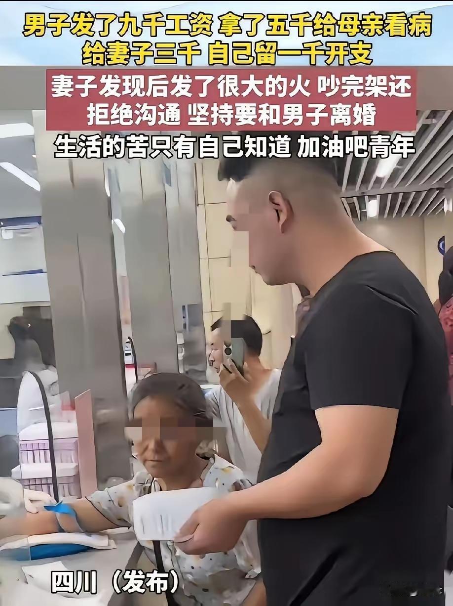 男儿有泪不轻弹,只是未到伤心处。四川一男子发了9000块钱工资,刚好母亲生病,然后他在未与妻子沟通的情况下转了5000给母亲去治病,因为他觉得父母生病做儿子的给钱治病很正常,就算妻子知道了能理解,所以就先斩后奏了。 他以为自己做了该做的事,心里还踏实了不少,觉得母亲的病能早点缓解,比什么都重要。 可他忘了,家里的开销、孩子的花费、日常的柴米油盐,从来都不是他一个人在扛。 妻子回家发现少了一大笔钱,一问才知道转给了婆婆,当场就绷不住了,两个人直接吵了起来。 妻子委屈的是,家里的钱不是私房钱,这么大的事,连一句商量都没有。 丈夫难受的是,那是生他养他的妈,生病了拿钱救命,难道还要被指责吗。 一边是生养自己的母亲,一边是一起过日子的伴侣,他夹在中间,左右不是人。 很多人都说他孝顺,也有不少人说他不懂尊重妻子,各有各的道理,谁也没法轻易说服谁。 现实就是这样,孝顺和夫妻感情,从来都不是对立的,可偏偏最容易撞在一起。 真正难的不是拿钱治病,而是既顾好父母,又不寒了身边人的一颗心。 很多家庭的矛盾,不是谁对谁错,而是少了一句沟通,多了一次想当然。 你觉得我该理解,我觉得你该尊重,一来二去,小事就变成了过不去的坎