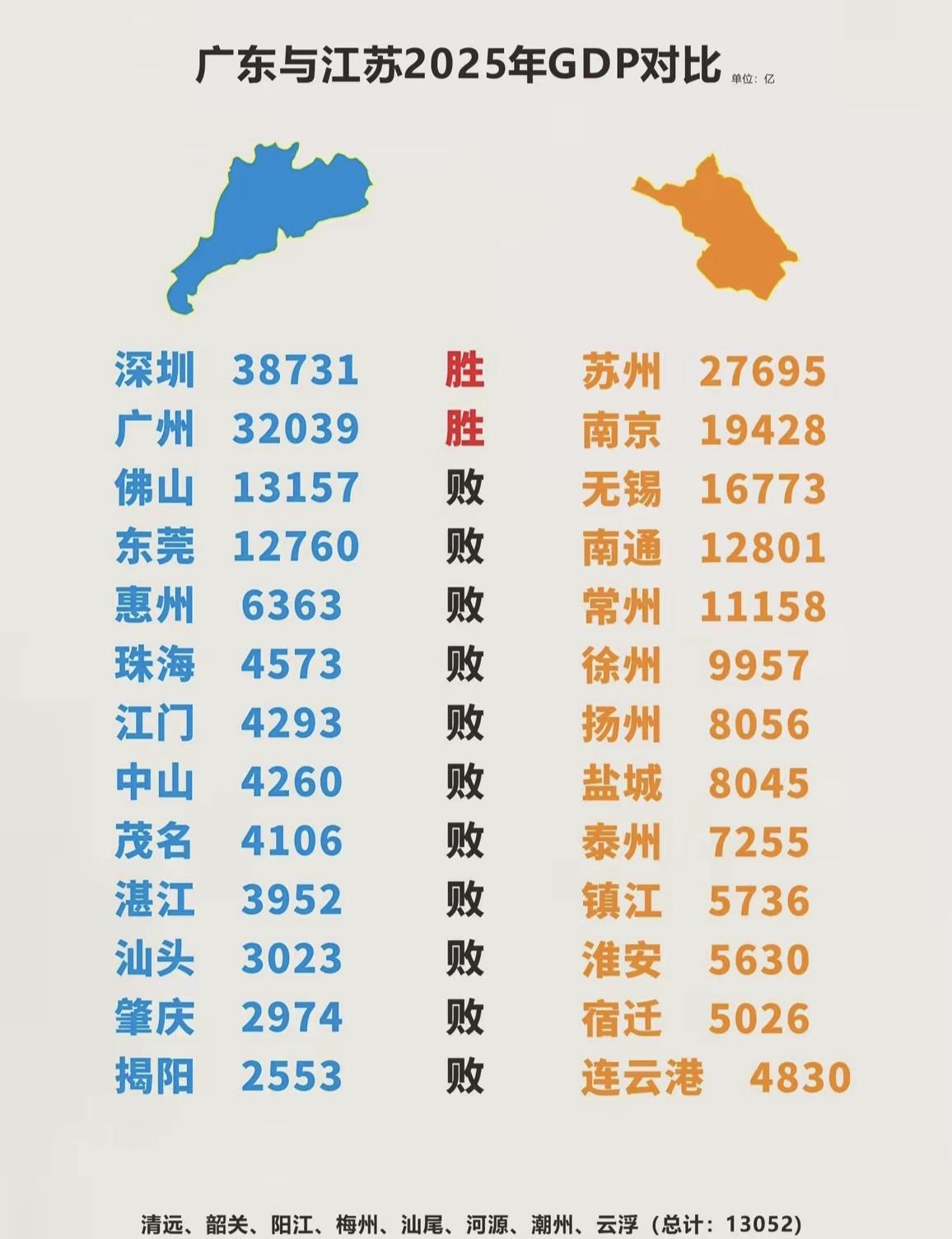一句话总结就是广东发展不平衡,省内城市差距大,江苏都是大平原,发展相对均衡。但是
