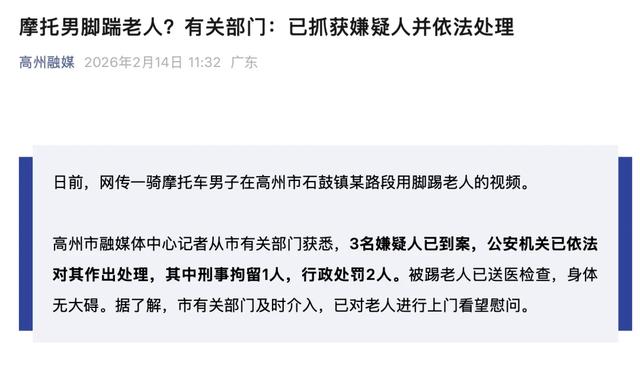记者从市有关部门获悉,3名嫌疑人已到案,公安机关已依法对其作出处理,其中刑事拘留1人,行政处罚2人。被踢老人已送医检查,身体无大碍。据了解,市有关部门及时介入,已对老人进行上门看望慰问。