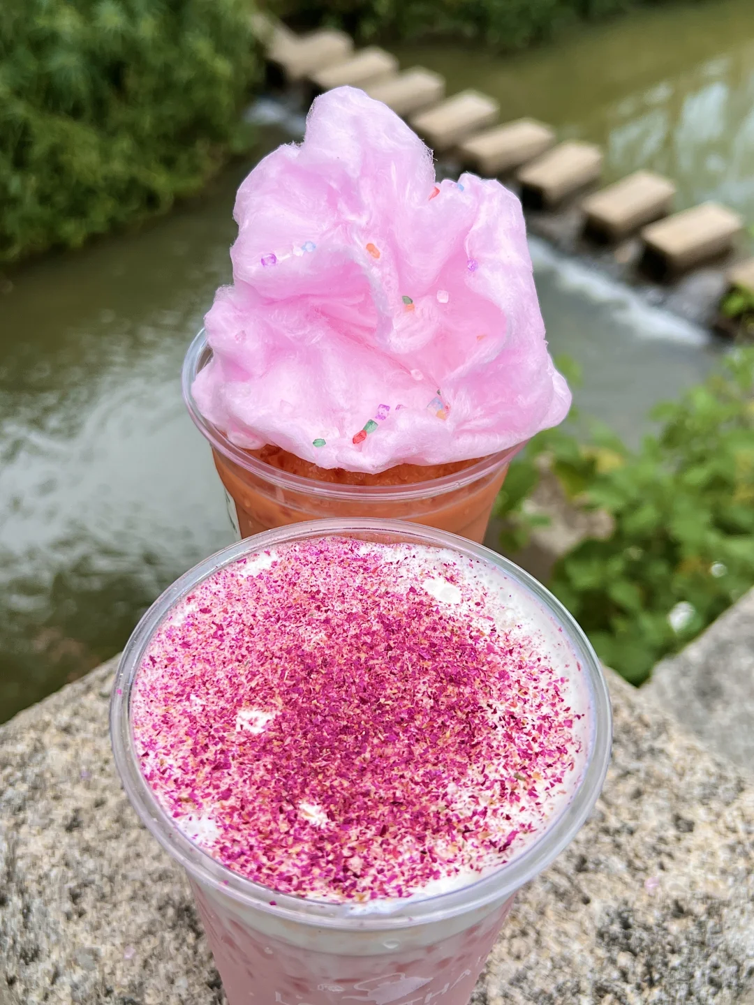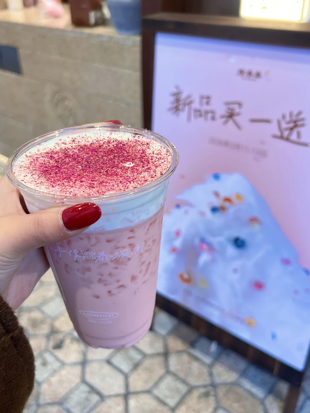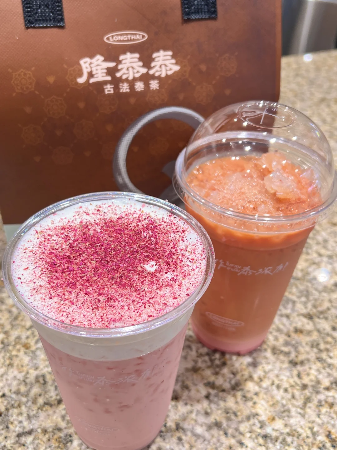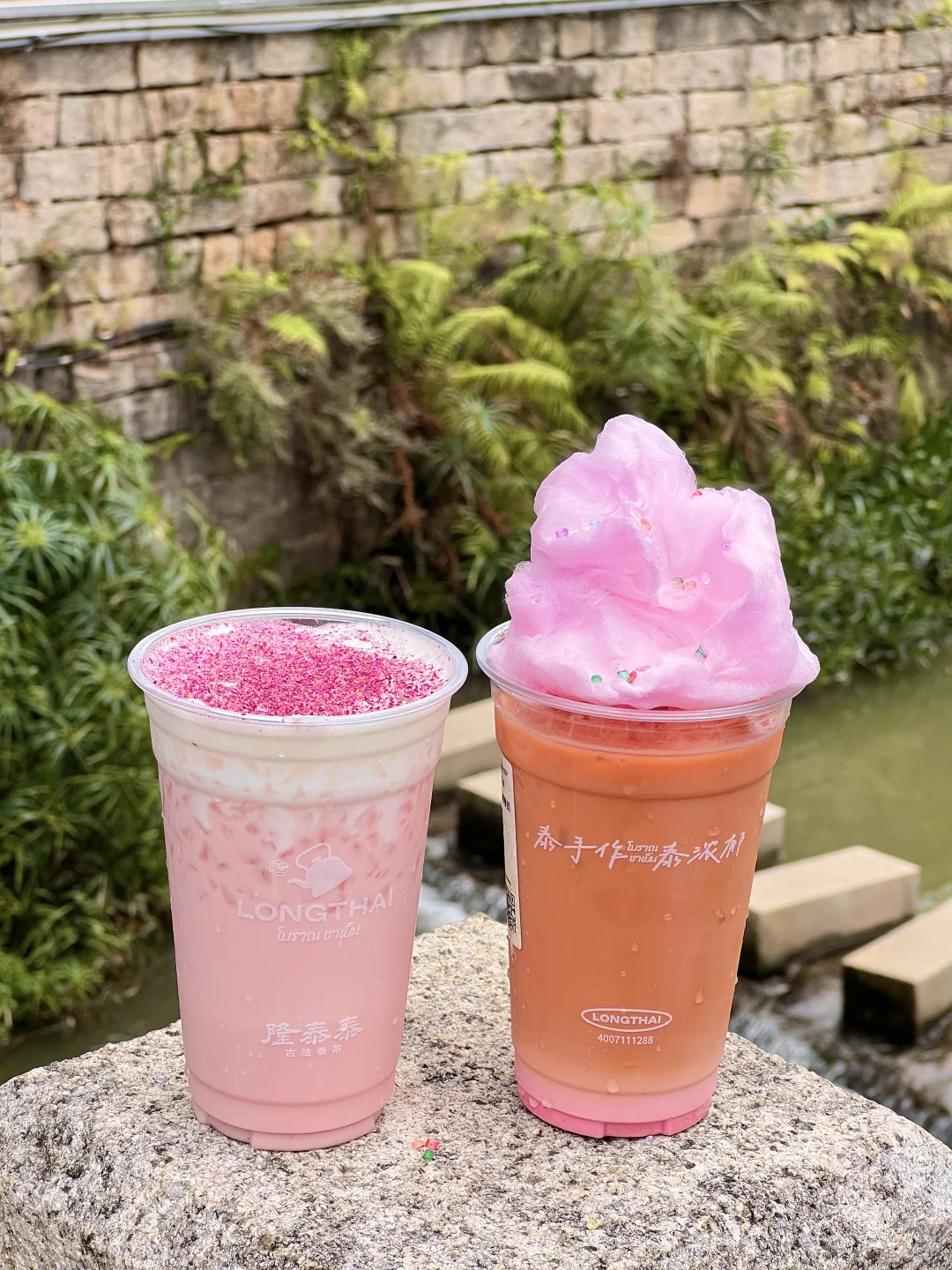 隆泰泰限定! 简直好喝到无语! 超级粉嫩的奶茶~ 手拈•玫瑰棉棉泰奶 顶着软绵绵的棉花糖 泰奶+清甜花香✨ 手拈•玫瑰咸法酪 咸香浓郁的玫瑰奶酪在舌尖化开 混合着若隐若现的玫瑰香气 甜中带咸 咸里透香 口感层次直接封神✨
