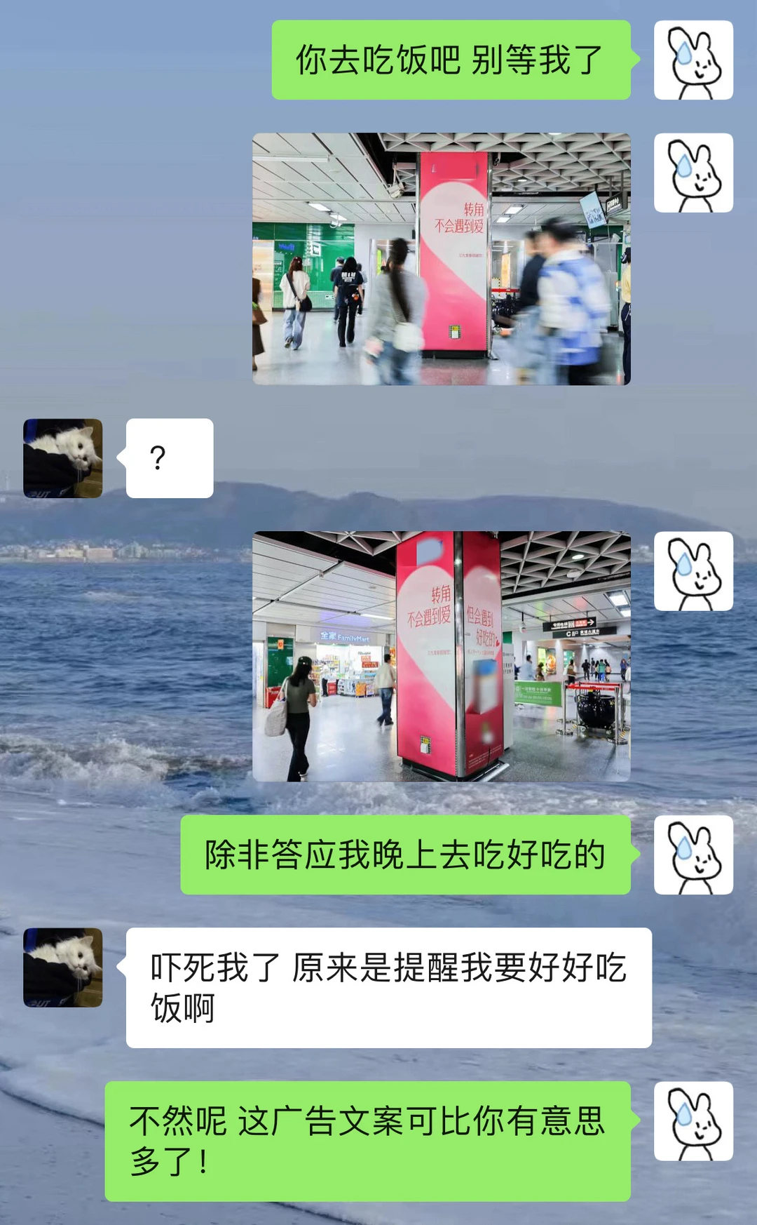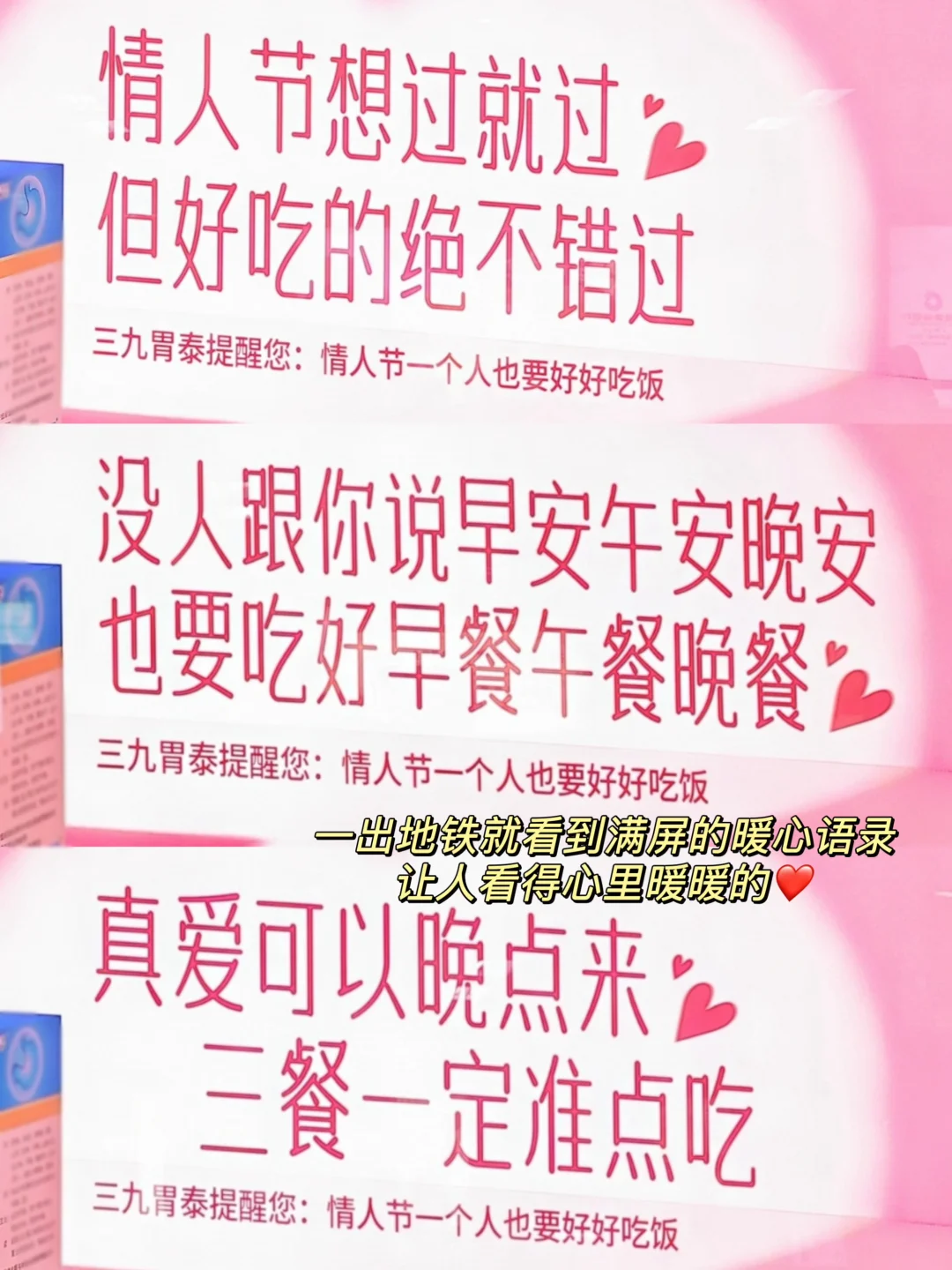 欢迎收看对抗小情侣的恋爱日常 同频的人就像礼物🎁 今天情人节 又是最后一个工作日 本来应该是和男朋友一起开开心心的庆祝的 但男朋友回去过年了 有情人但不能一起过节 心情还是点沮丧的 但是今天出门看到地铁口满屏的暖心文案 提醒我们一个人也要好好吃饭 爱自己自己才是最重要!!让人看得心里暖暖的! 这个广告这一天真的上大分!拯救了我这个受伤的小心灵 不说了 下了班马上就干饭去!!!