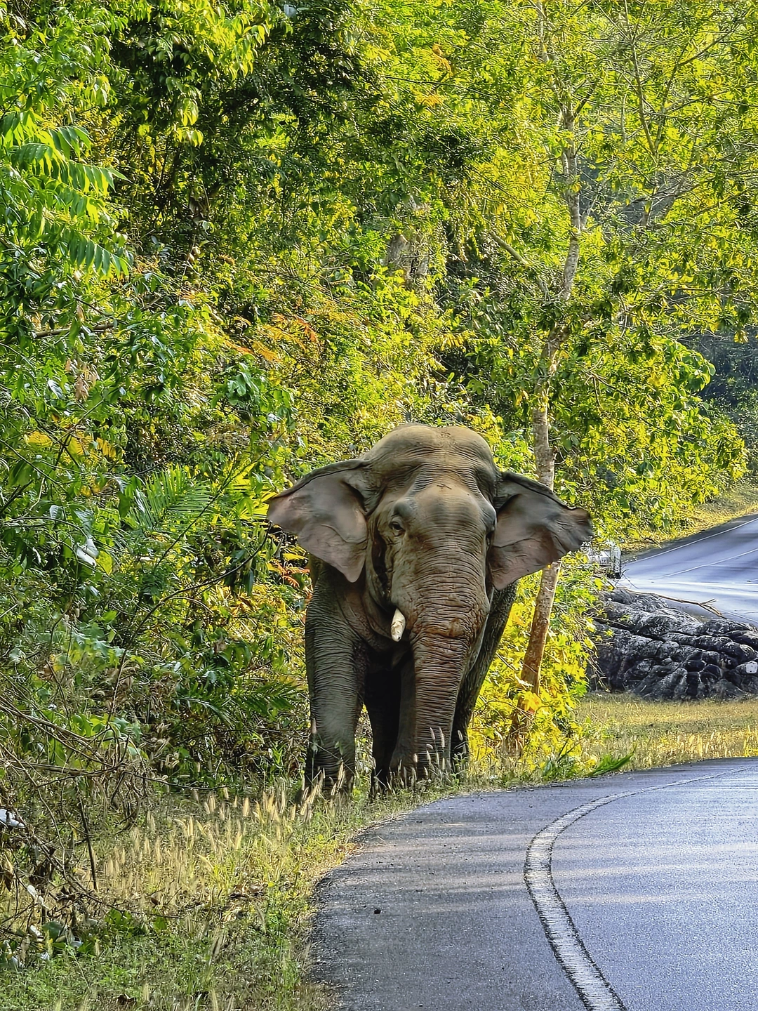 就在路边,大象完全不care人和车,它一动,全体避让。