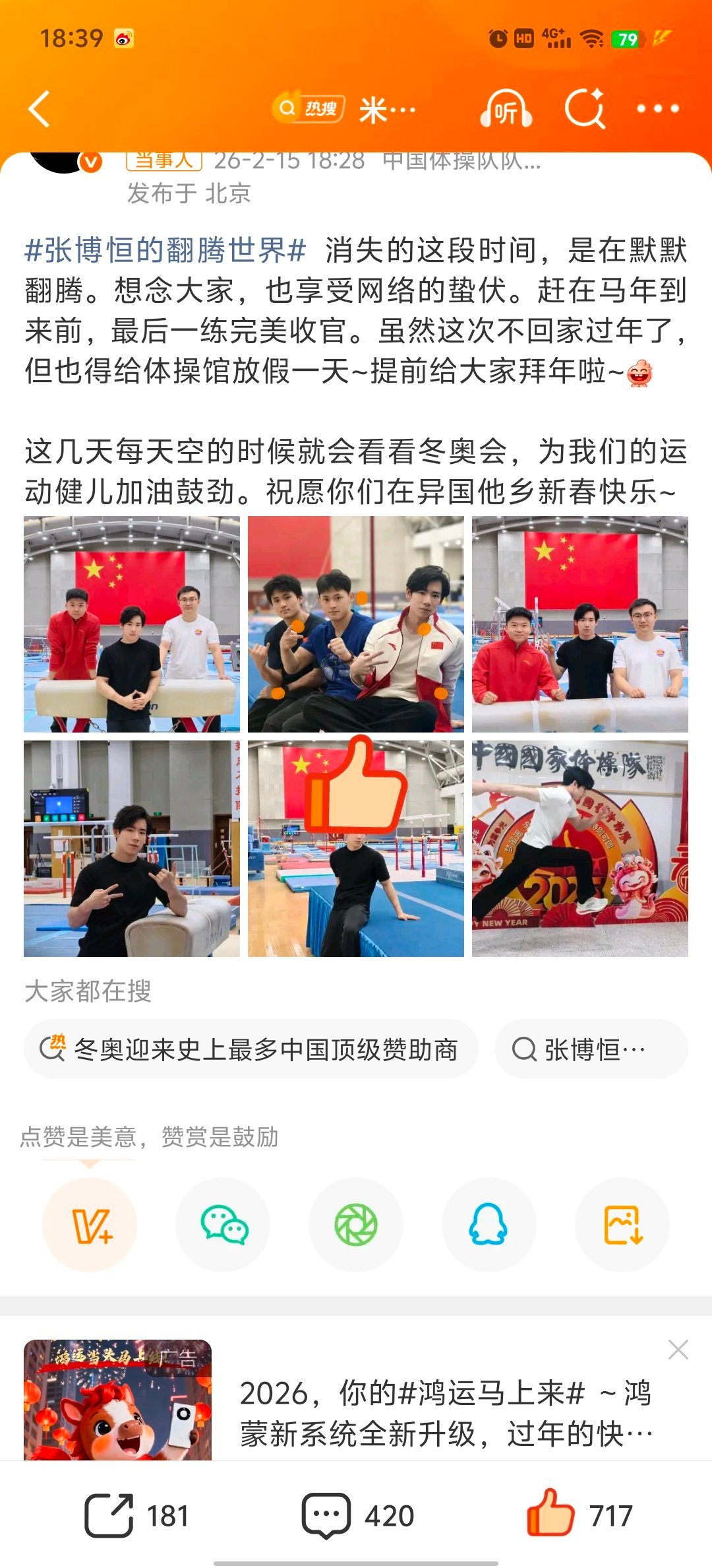 张博恒祝冬奥健儿新春快乐张博恒发博表示最近在默默翻腾,和看米兰冬奥会。还祝愿他们新春快乐。既然提到新春祝福,我也赶潮流用豆包AI生图制作了一个图,为远在异国他乡的中国健儿加油。祝愿他们新春快乐,比赛加油!体育AI过大年过个有ai年
