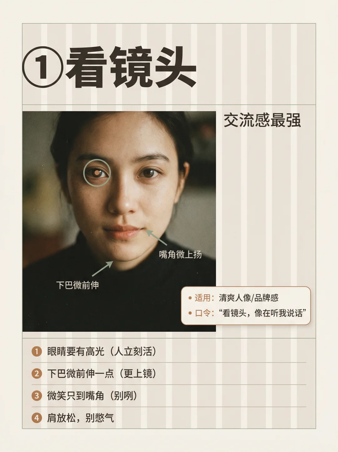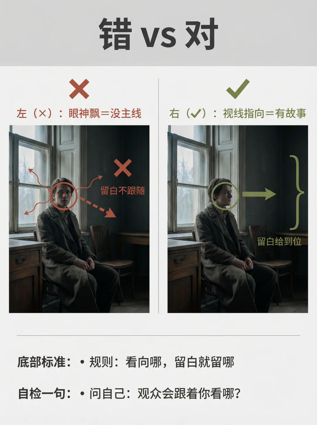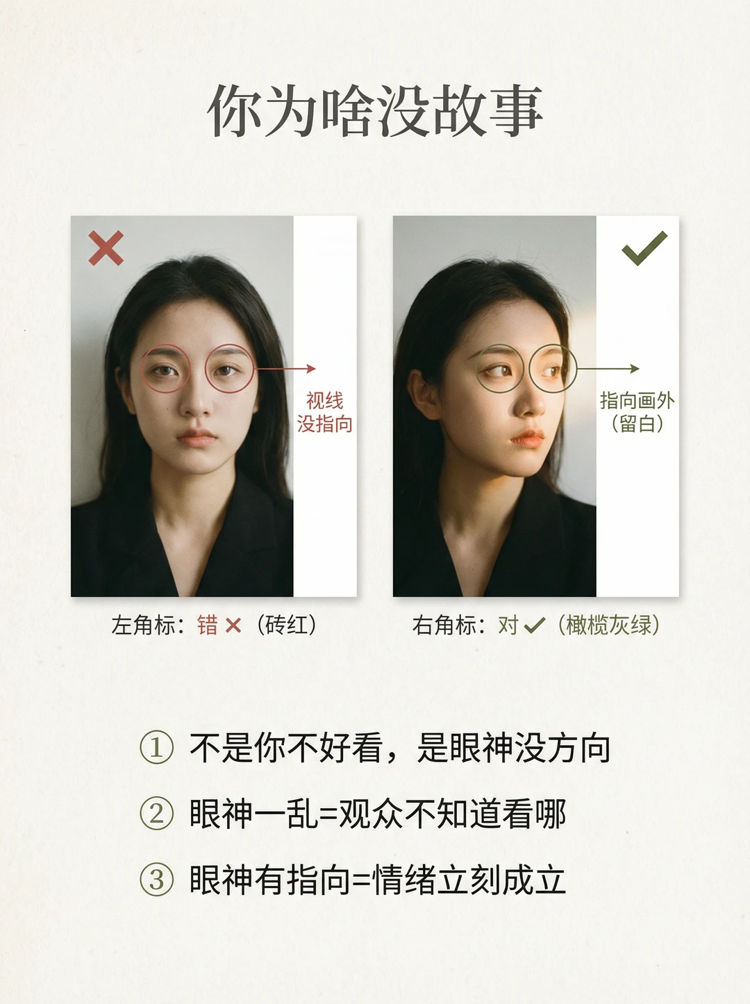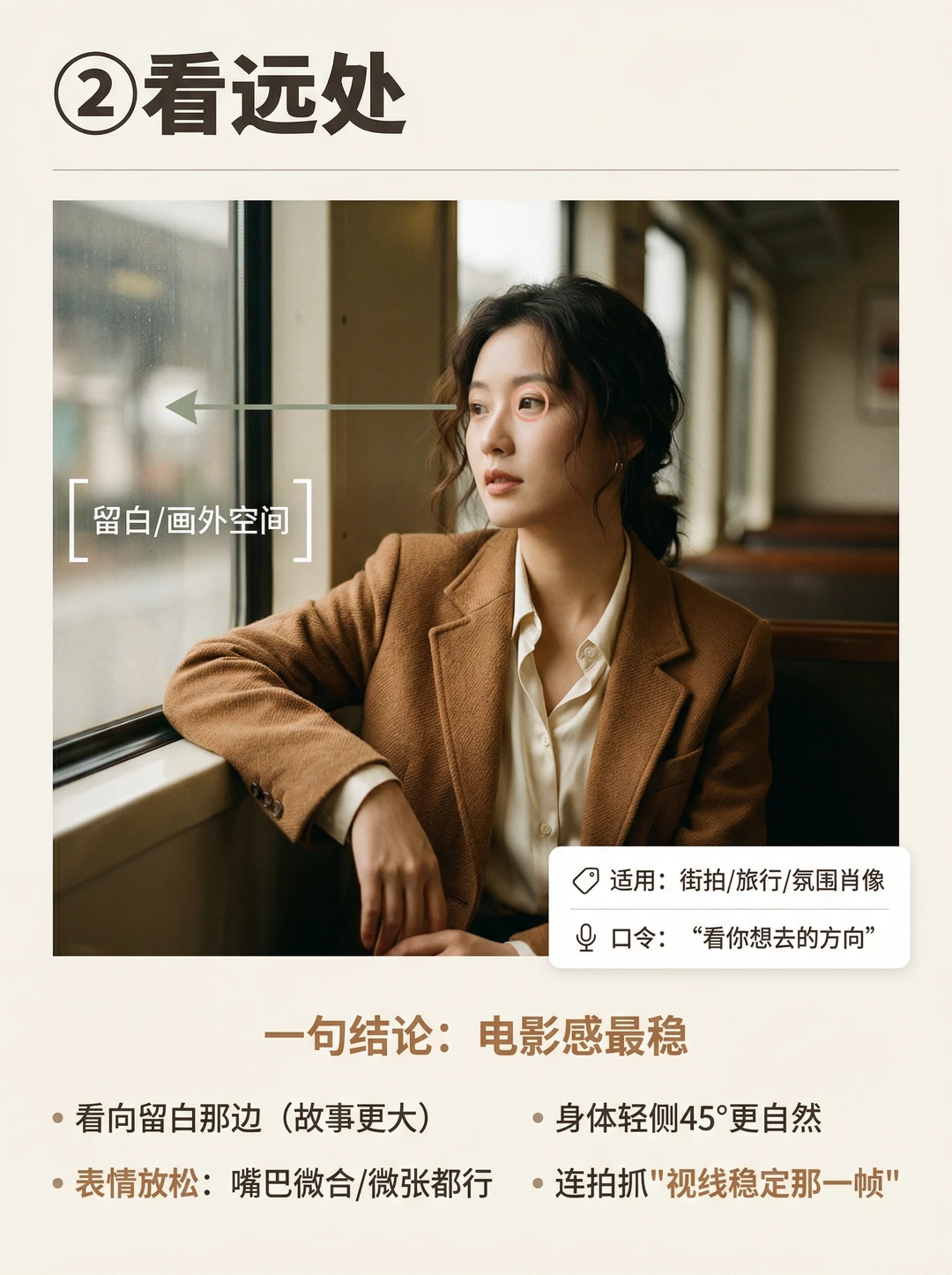 你有没有这种感觉👇 📸 人像拍出来明明清晰、构图也没错,但就是没故事、没情绪、很空😩 很多时候问题不在表情,而在一个关键:眼神没方向✅ 这期我把“眼神=情绪开关”做成4个方向模板,普通人照抄就能用✨ ① 看镜头:交流感最强(像在听你说话) ② 看远处:电影感最稳(把故事放到画外) ③ 看下方:新手救命不尴尬(给自己一个任务) ④ 看侧后方:抓拍感最强(刚要回头那一帧) 记住一句就够:看向哪,留白就留哪📌