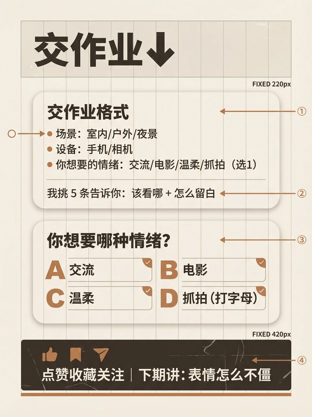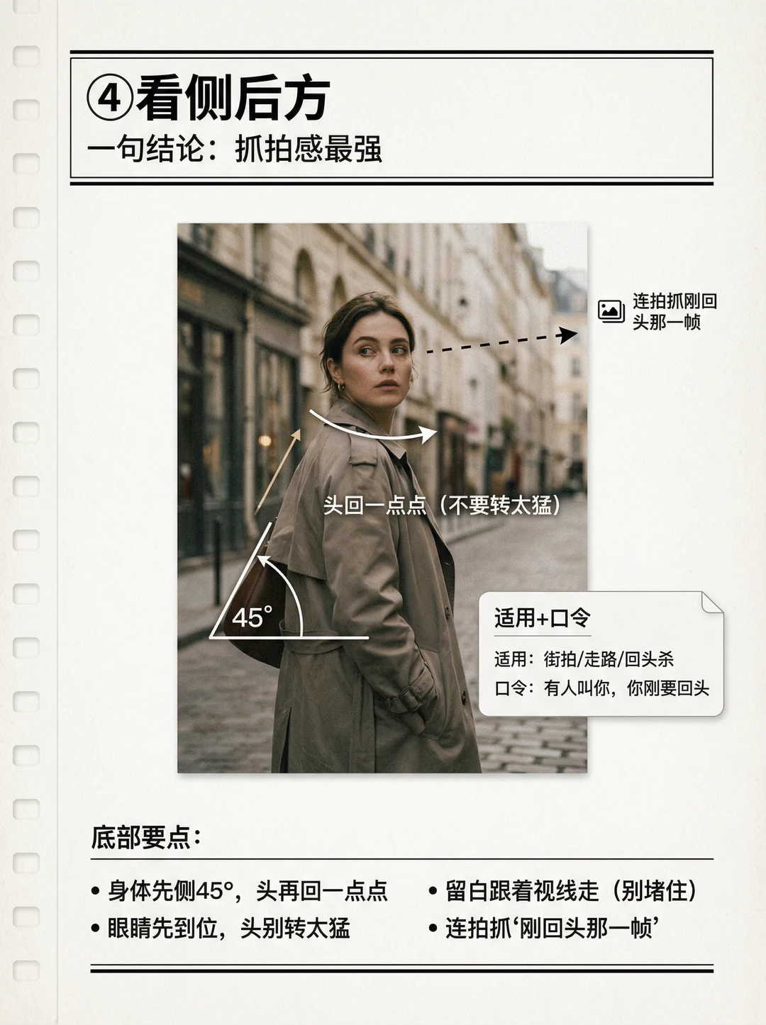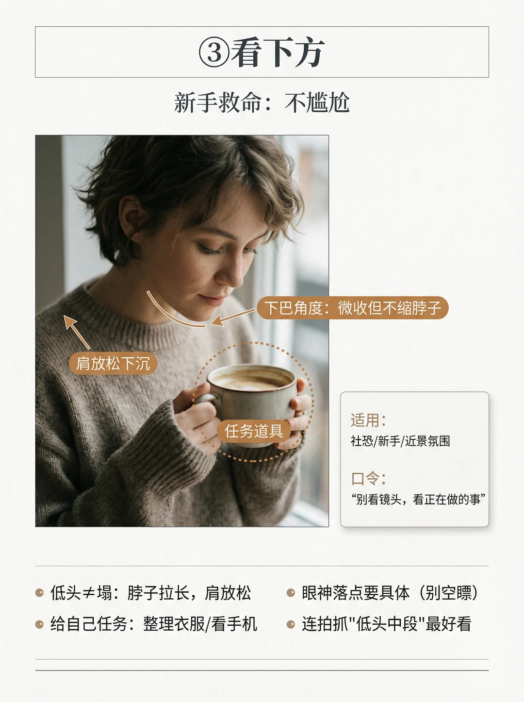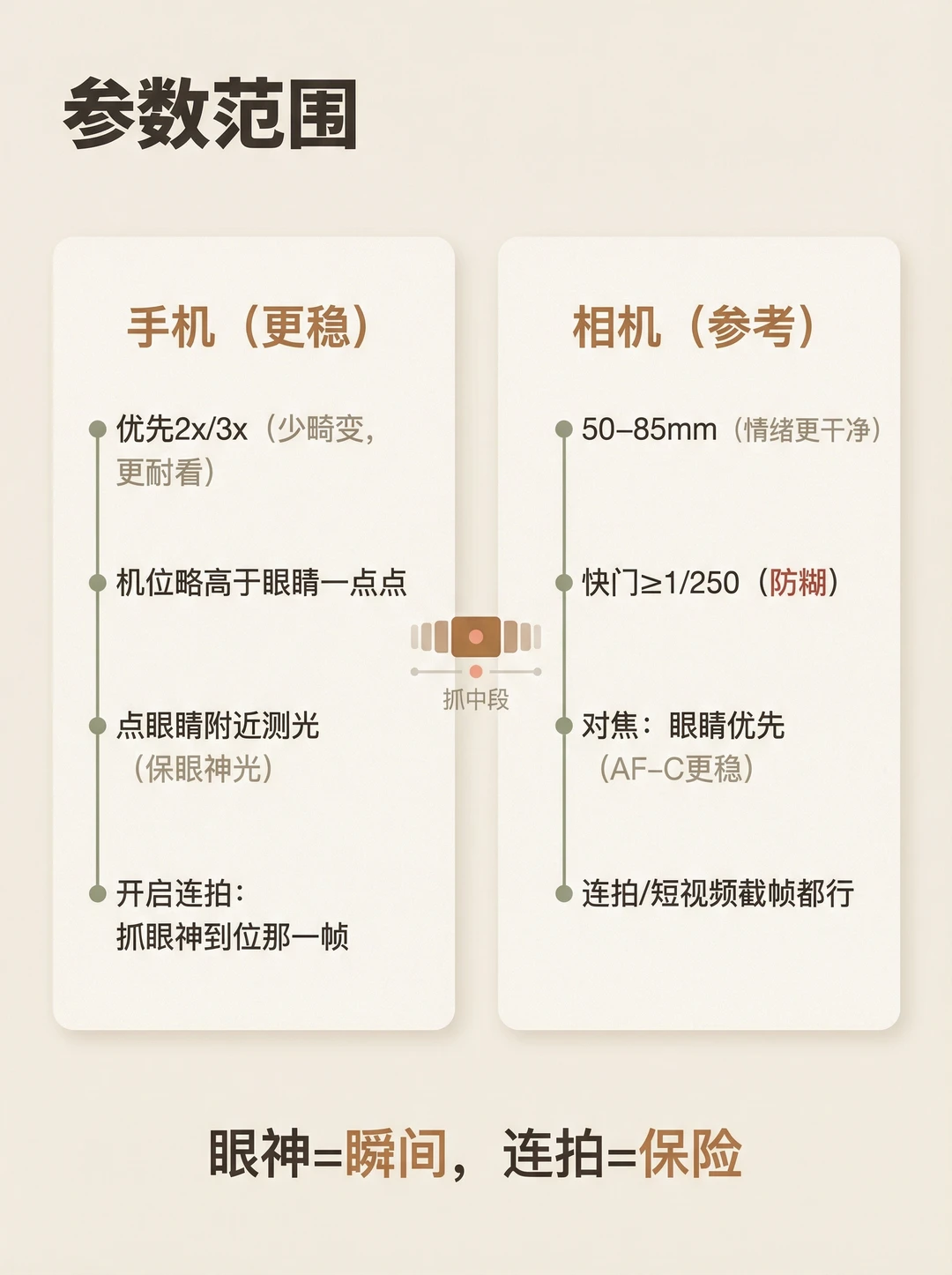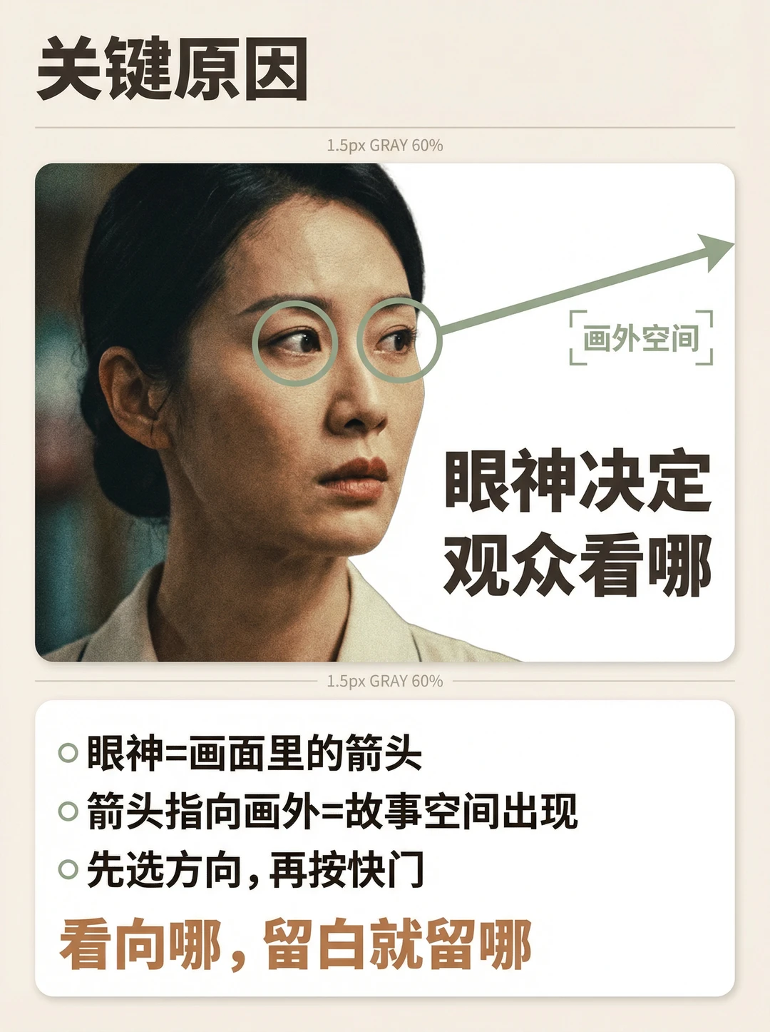 你有没有这种感觉👇 📸 人像拍出来明明清晰、构图也没错,但就是没故事、没情绪、很空😩 很多时候问题不在表情,而在一个关键:眼神没方向✅ 这期我把“眼神=情绪开关”做成4个方向模板,普通人照抄就能用✨ ① 看镜头:交流感最强(像在听你说话) ② 看远处:电影感最稳(把故事放到画外) ③ 看下方:新手救命不尴尬(给自己一个任务) ④ 看侧后方:抓拍感最强(刚要回头那一帧) 记住一句就够:看向哪,留白就留哪📌