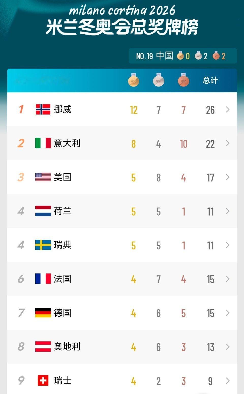 米兰冬奥会2026年2月16日米兰冬奥会奖牌榜中国队2️⃣银2️⃣铜暂时排名19