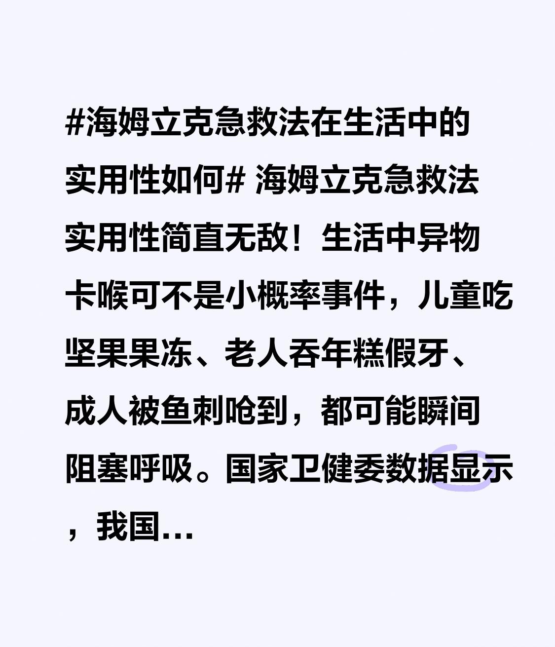 海姆立克急救法实用性简直无敌!生活中异物卡喉可不是小概率事件,儿童吃坚果果冻、老人吞年糕假牙、成人被鱼刺呛到,都可能瞬间阻塞呼吸。国家卫健委数据显示,我国每年5岁以下儿童意外窒息死亡超3000例,而气道完全梗阻黄金抢救时间仅4 - 6分钟,等救护车根本来不及。 这急救法不用专业设备,徒手就能操作。像成都援鄂护士24秒救回糖果卡喉女童,山东老师20秒帮学生排出圆珠笔零件。2025年国际指南改用“背5腹5,交替循环”,安全性更高。掌握它,关键时刻能救命!