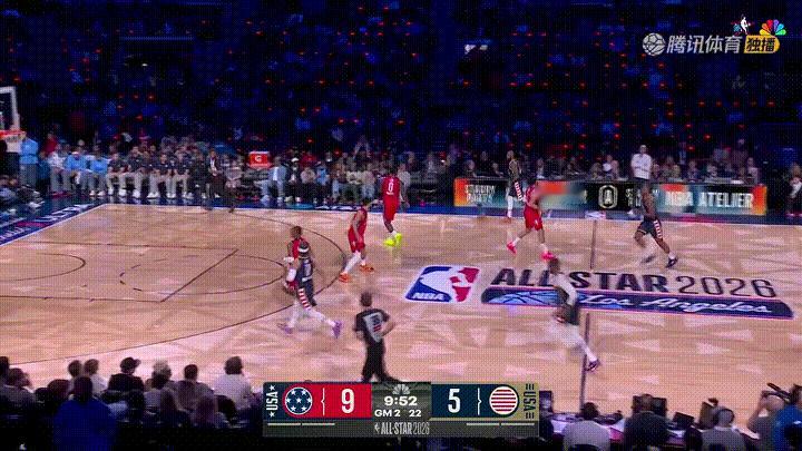 湖人老将詹姆斯真是手感火热!在今天进行的美国条纹队和美国星队的全明星正赛中,当时比赛进行到了第九分多钟,詹姆斯在前场接队友杜兰特的底线发球后张手命中了一记让人热血沸腾的超远三分,帮助球队将场上分差缩小到了1分。 老实说,詹姆斯的手感真是太火热了,难道41岁的詹姆斯又要统治全明星了吗?