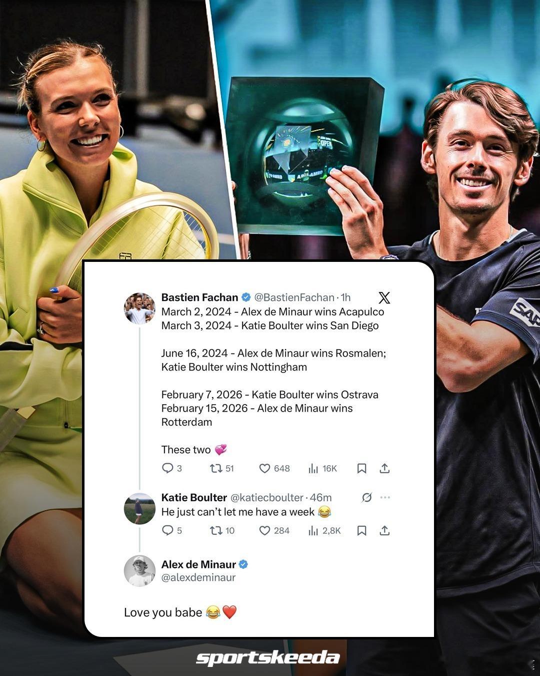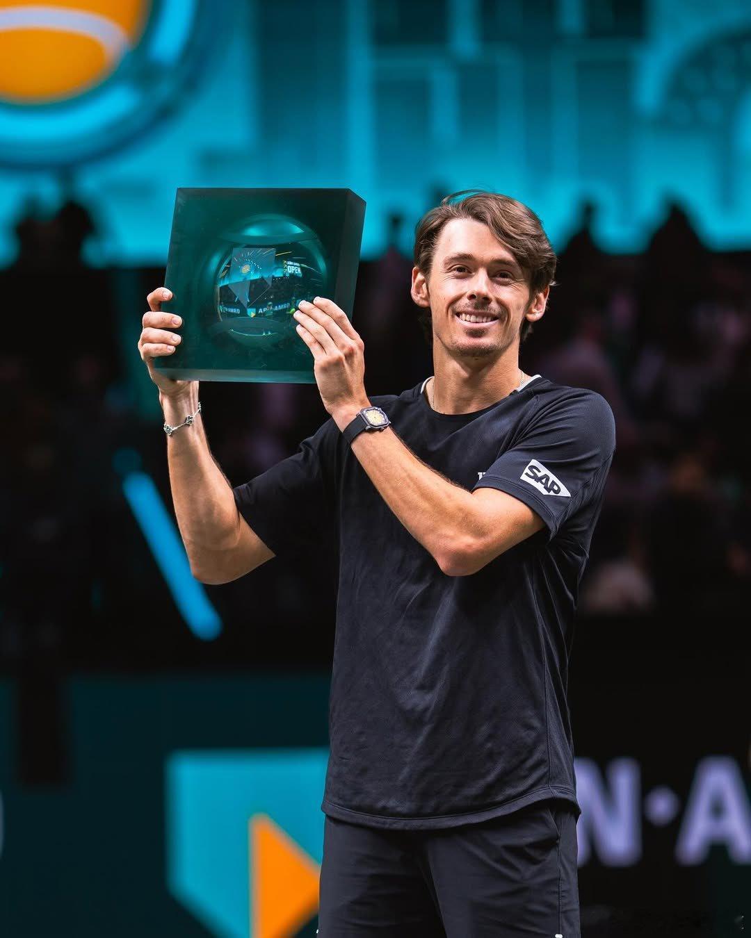 德米纳尔和女友博尔特继续同步夺冠!两人撒狗粮!2024年3月2日 德米纳尔在阿卡普尔科夺冠2024年3月3日 博尔特在圣迭戈夺冠2024年6月16日 德米纳尔在荷兰赛夺冠博尔特在诺丁汉夺冠2026年2月7日 博尔特在俄斯特拉发夺冠2026年2月15日 德米纳尔在鹿特丹夺冠德米纳尔连续三年鹿特丹决赛终于登顶:2024不敌辛纳2025不敌阿尔卡拉斯2026击败阿利亚希姆生涯第11冠(4个500、7个250)这很澳网