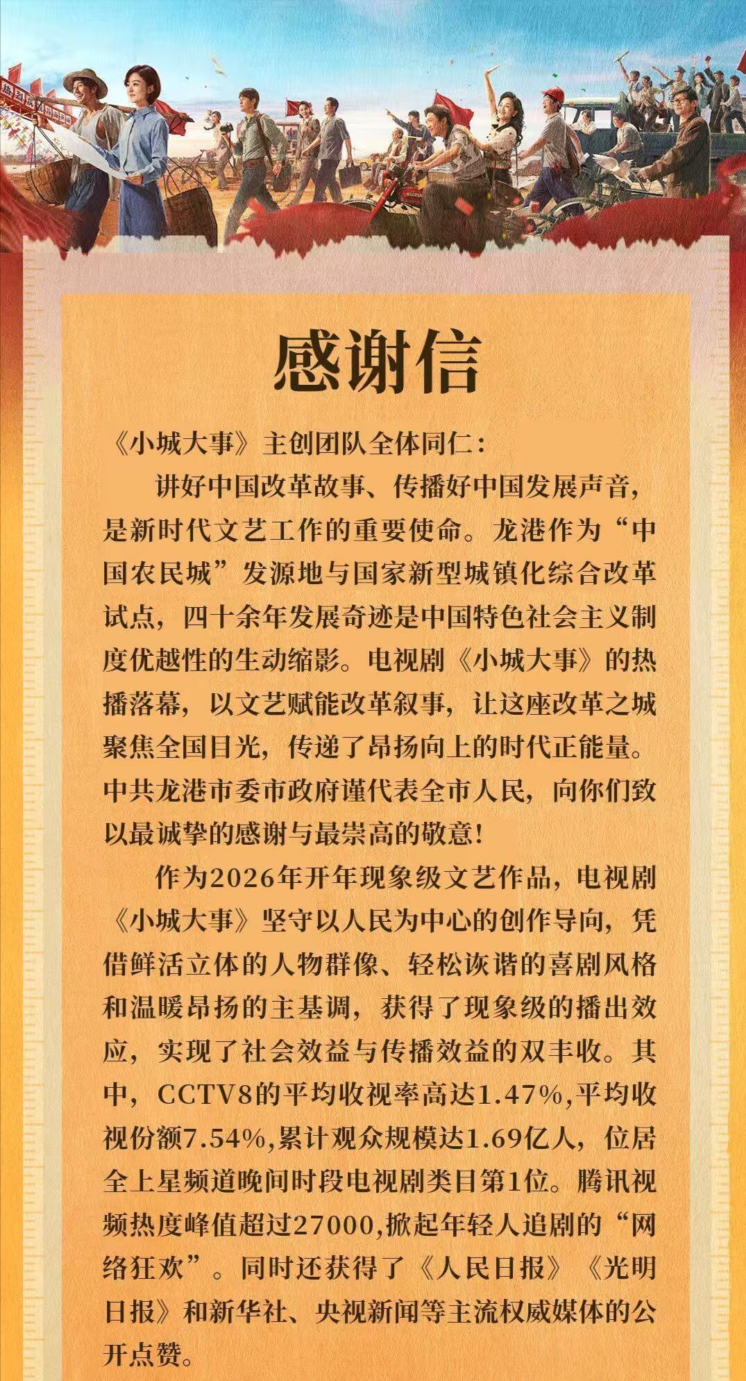 《小城大事》龙港感谢信!好用心啊,是人民实践者与文艺工作者的双向奔赴!2026开年现象级爆剧,实现了社会效应和传播效应的双丰收!小城大事