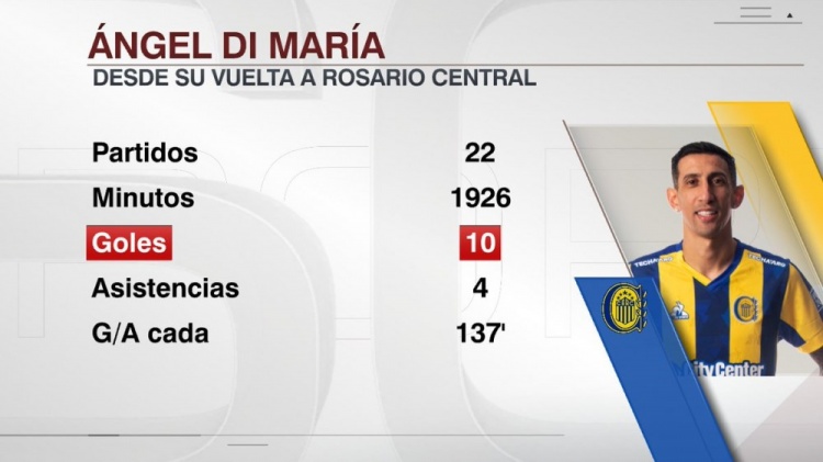 据ESPN统计,迪马利亚回顾罗萨里奥中央以来出战22场比赛,出场时间1926分钟,打进10球,助攻4次,平均每137分钟参与1球。
