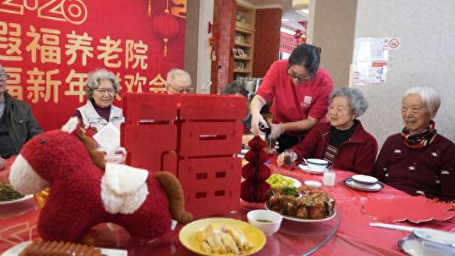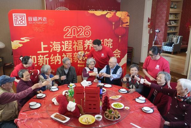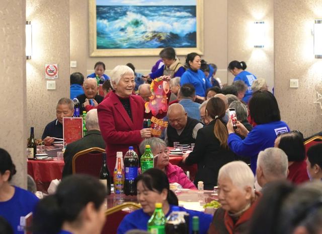 2月15日,上海遐福养老院张灯结彩喜气洋洋,老人欢聚一堂吃年夜饭迎新纳福。