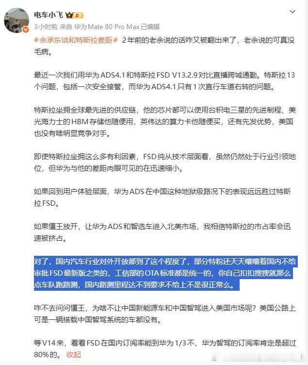 截止目前为止,特斯拉的车队在国内跑的路测里程不足工信部要求的三分之一。中国是持一直坚持开放态度的、也是坚持一视同仁的,所有厂商都是一样的标准,所以现在的问题在特斯拉自己这边。至于特斯拉的测试车队为什么规模小、为什么跑得磨磨叽叽,那就只有特斯拉自己知道了。我是非常希望FSD能好好在国内跟华为ADS全面PK的,现在华为ADS断崖式领先其它国内方案,是应该有人上来继续给足压力形成良性竞争。特斯拉fsd