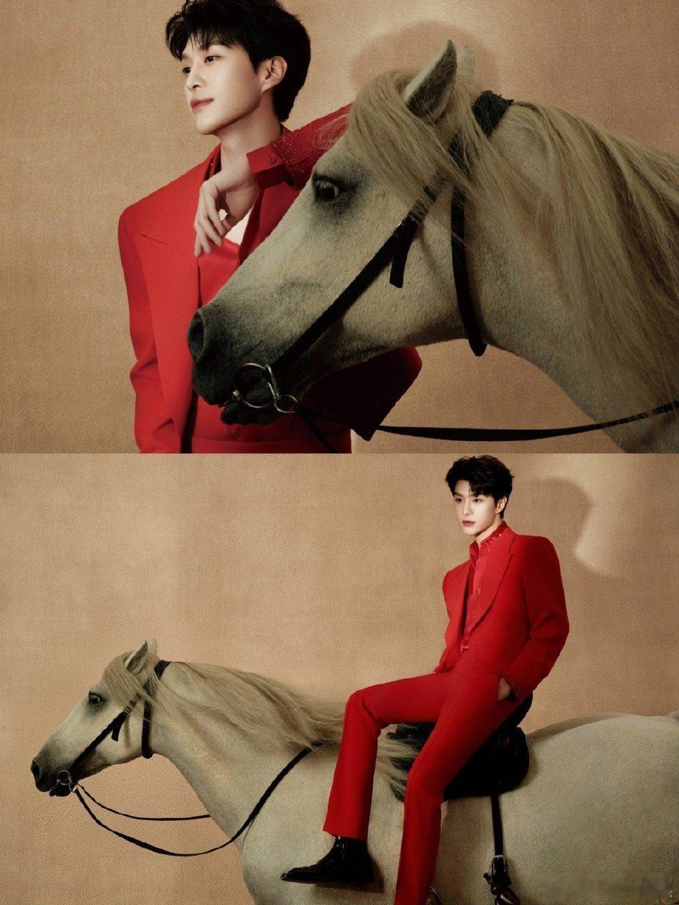 范丞丞春晚造型好红火 范丞丞的春晚首秀造型好绝!一身红西装干练又贵气,牵马而立的画面太有张力。马年穿红寓意绝佳,已经迫不及待想看他今晚的舞台表现了!