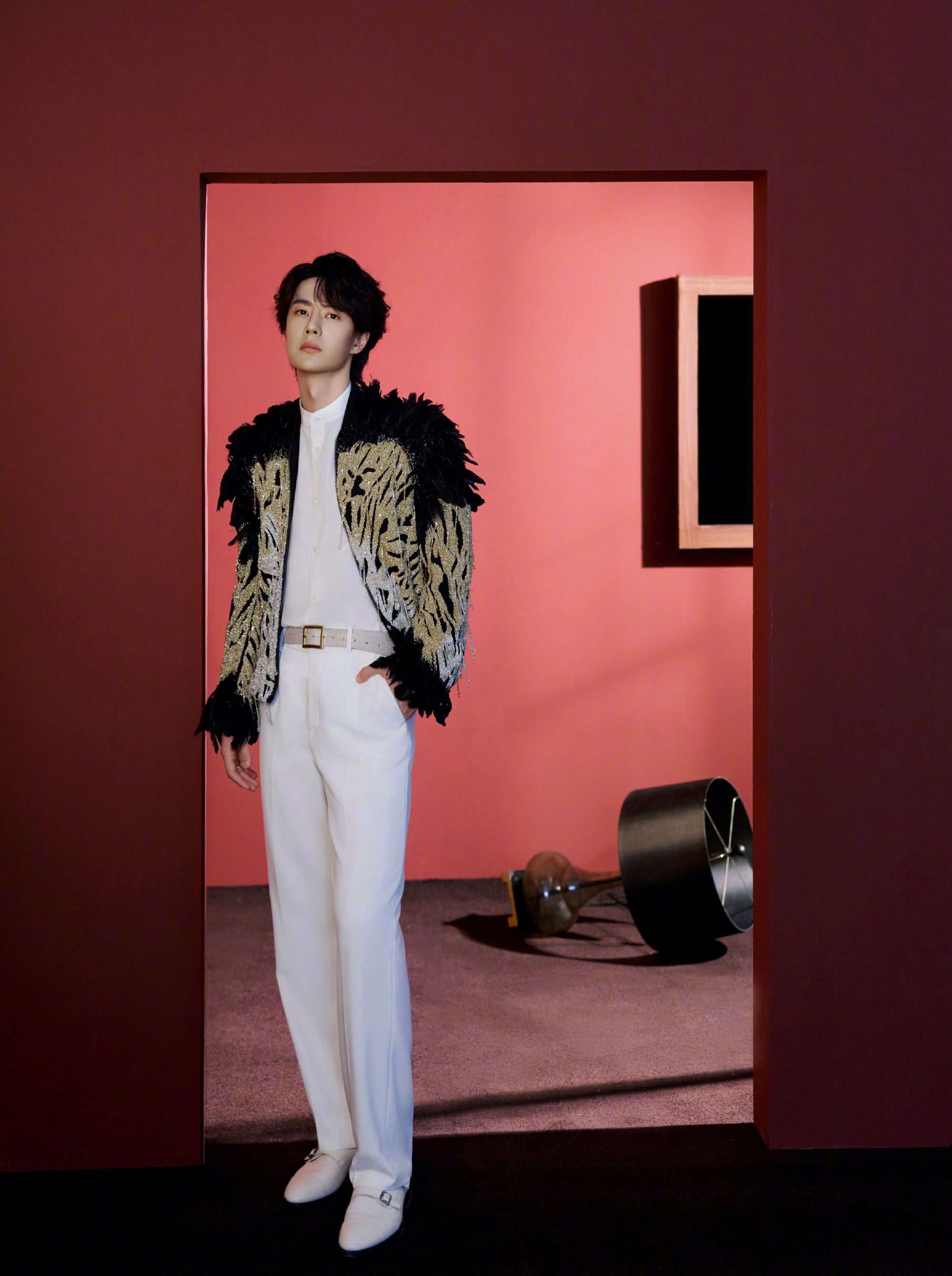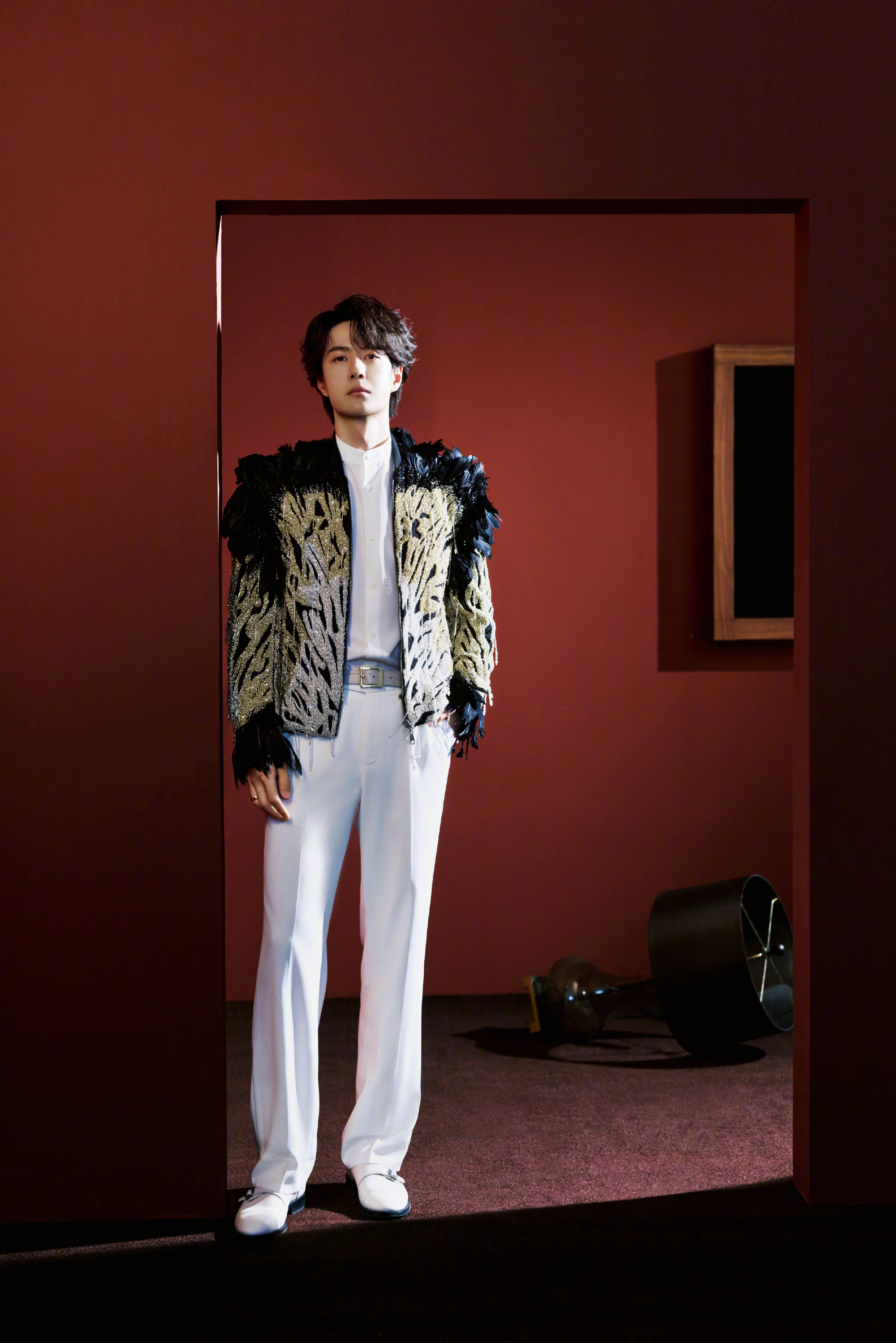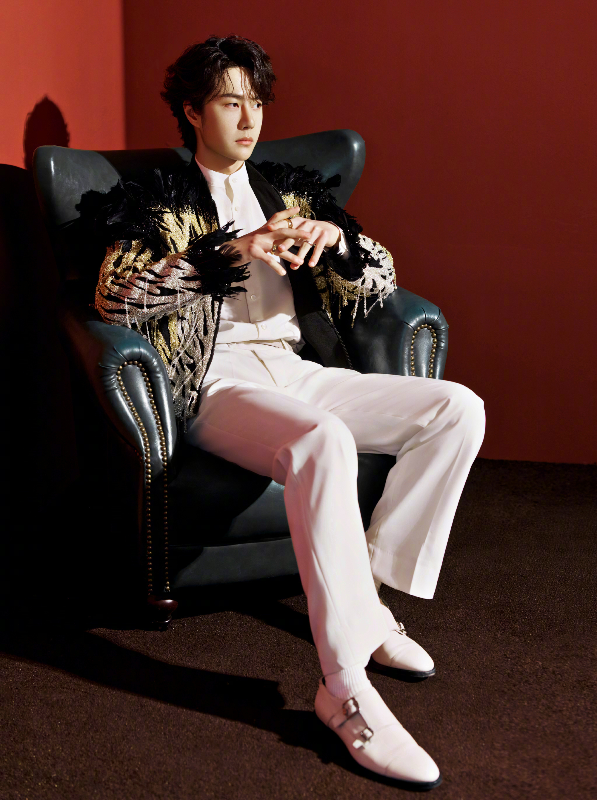 王一博 春晚造型图,身穿刚刚发布不久的Saiid Kobeisy 2026春夏定制系列出镜,黑金配色的羽毛夹克,佩戴着香奈儿COCO CRUSH系列珠宝,不需多言的气质,矜贵又华丽的王子。期待今晚《闪耀动起来》舞台。👑✨