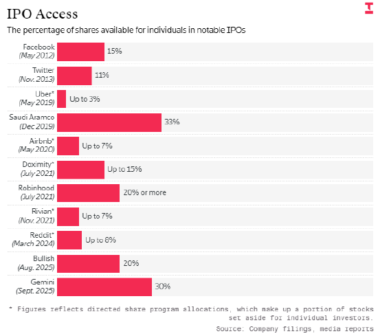 不过,在IPO中获配股份的个人投资者也可能蒙受损失。去年,加密货币交易所Gemini与Bullish分别向个人投资者分配了高于常规的30%和20%额度,但两家公司上市首日大涨后,股价较发行价现已暴跌超50%。