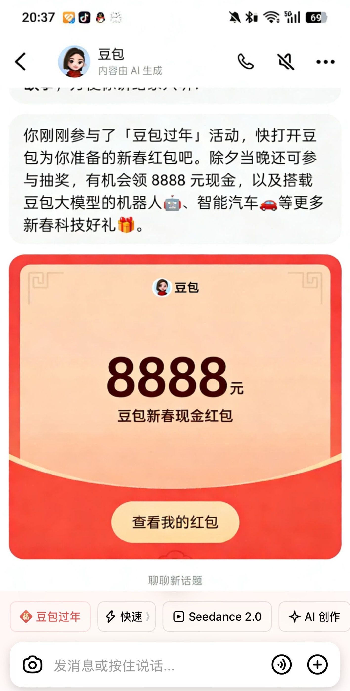 还没用上豆包的强烈建议抓紧下载一下APP,写祝福生成AI头像这些都是当前使用频率非常高的功能,包括生成朋友圈祝福语配图、年夜饭菜谱等等,所有这个盛大节日最需要的功能,它都有,可以帮我们省很多麻烦!另外这次豆包还准备了十万份搭载豆包大模型的科技好礼,从动力机器人到奥迪E5再到奔驰纯电CLA,甚至豆包科技好礼有春晚同款机器人 ,这个诱惑真的很难抵挡,尤其是AI、智能化科技集中爆发的时代,科技的力量是我们无法想象的,让更多的非从业者体验我觉得是非常有意义的。参与方式也很简单,打开豆包APP,选择“豆包过年”,进入开好运锦囊活动界面,根据总台主持人的引导体验AI玩法即可参与,在这里提前祝大家能中大奖!!