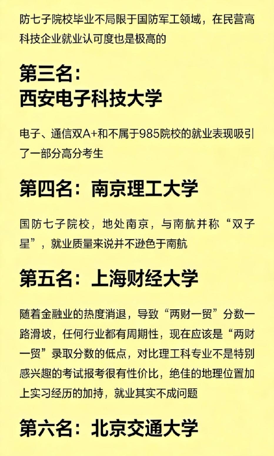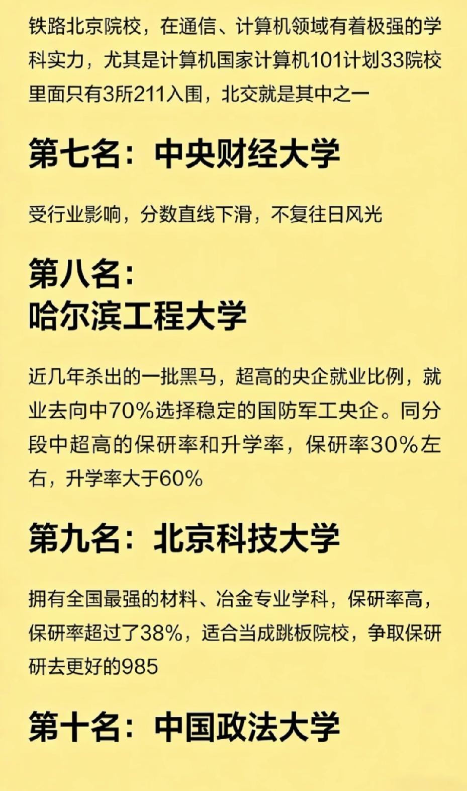 理科生必看10所“比985还香”的211院校! 在国内高校中,不少211凭借顶尖学科和区位优势,在理科领域的实力和就业表现,甚至超过了很多985。以下是理科生眼里含金量最高的10所211: 1. 北京邮电大学:通信、计算机顶尖,录取线直逼985,互联网、通信行业“黄埔军校”。 2. 南京航空航天大学:国防七子,江浙沪区位优势明显,录取分超西电,军工与民企就业双优。 3. 西安电子科技大学:电子、通信双A+,就业不输985,是电子信息领域的“实力派”。 4. 南京理工大学:国防七子,与南航并称“双子星”,兵器、自动化等专业就业强劲。 5. 上海财经大学:金融学科实力强,虽受行业周期影响分数下滑,但上海区位+实习资源,就业仍有保障。 6. 北京交通大学:铁路强校,通信、计算机实力突出,是国家计算机101计划中仅有的3所211之一。 7. 中央财经大学:财经强校,北京区位优势明显,金融、体制内就业竞争力强。 8. 哈尔滨工程大学:近年黑马,70%毕业生进入国防军工央企,保研率约30%,升学率超60%。 9. 北京科技大学:材料、冶金全国顶尖,保研率超38%,是进入更好985的优质跳板。 10. 中国政法大学:法学顶尖,北京实习资源丰富,与中财同为唯二拥有中央选调生资格的211。 这些211院校虽然没有985的头衔,但在各自的优势领域里,都是当之无愧的“行业黄埔”。对于理科生来说,选择这些学校的王牌专业,往往比去一所综合排名更高但专业实力一般的985,未来发展空间更大。 你觉得这10所211里,哪所最值得理科生报考?欢迎在评论区聊聊你的看法。