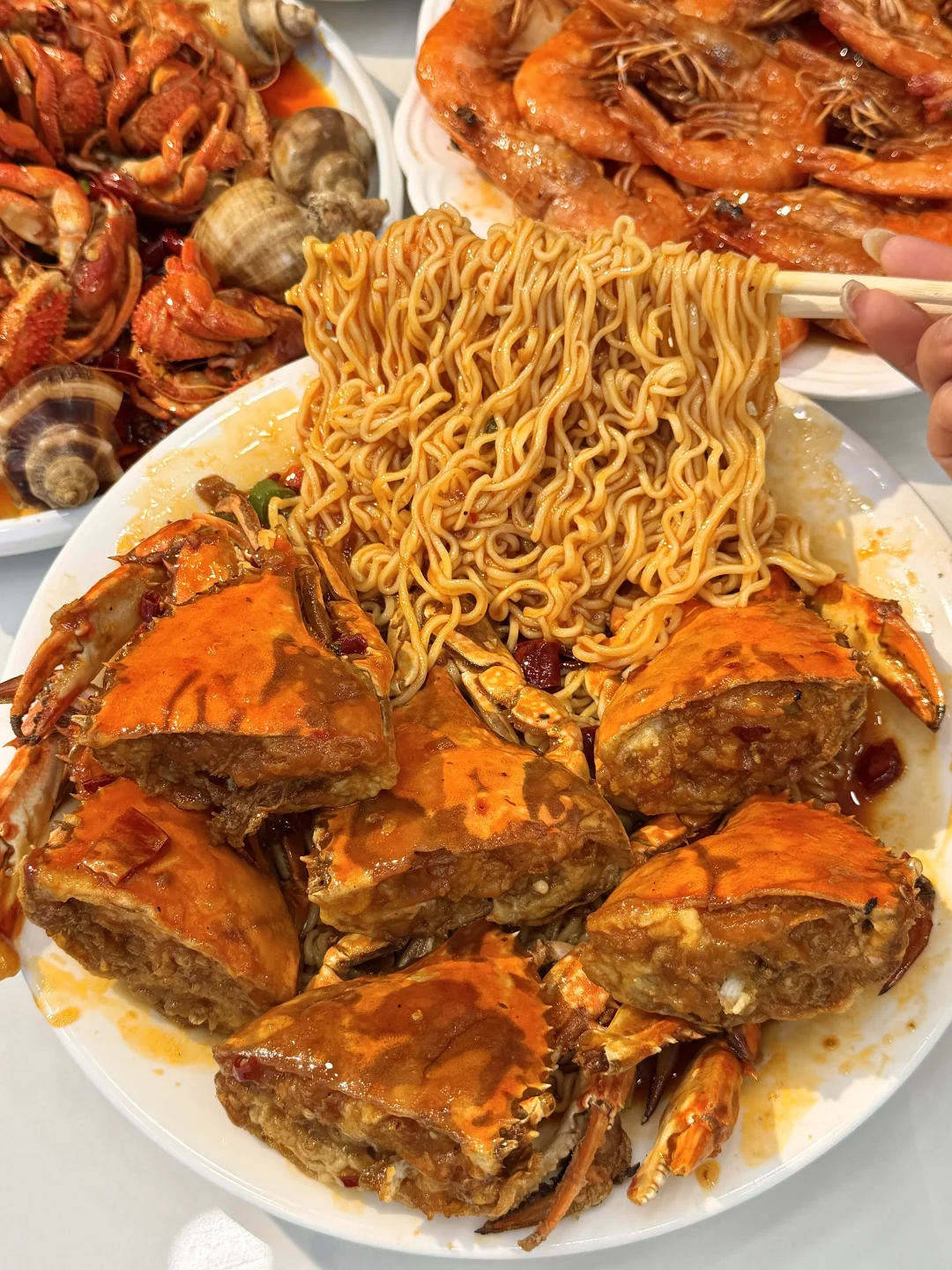 下飞机直奔这里!感谢青岛土著带路!现点现炒的香辣蟹拌面就是好吃啊!再来杯青岛小啤酒喝幸福哭了 就在台东步行街附近,种草这家叫📍尹记鸿运海鲜啤酒屋,听邻桌说开了很久了!口碑都是靠附近本地居民口口相传火起来的青岛美食🥹人均七八十左右,都是活的海鲜坚决不用冰冻海鲜,个人觉得比青岛绝大多数海鲜店都好吃! 辣炒虾怪、皮皮虾、生蚝煎蛋……真的一口惊艳!隔段时间不吃就会想念的程度!!
