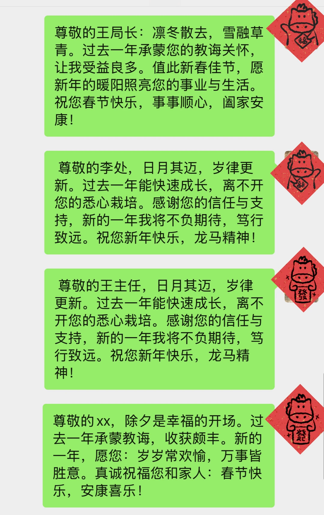 🏮 尊敬的xx,日月其迈,岁律更新。过去一年能快速成长,离不开您的悉心栽培。感谢您的信任与支持,新的一年,我将不负期待,笃行致远。祝您新年快乐,龙马精神!
