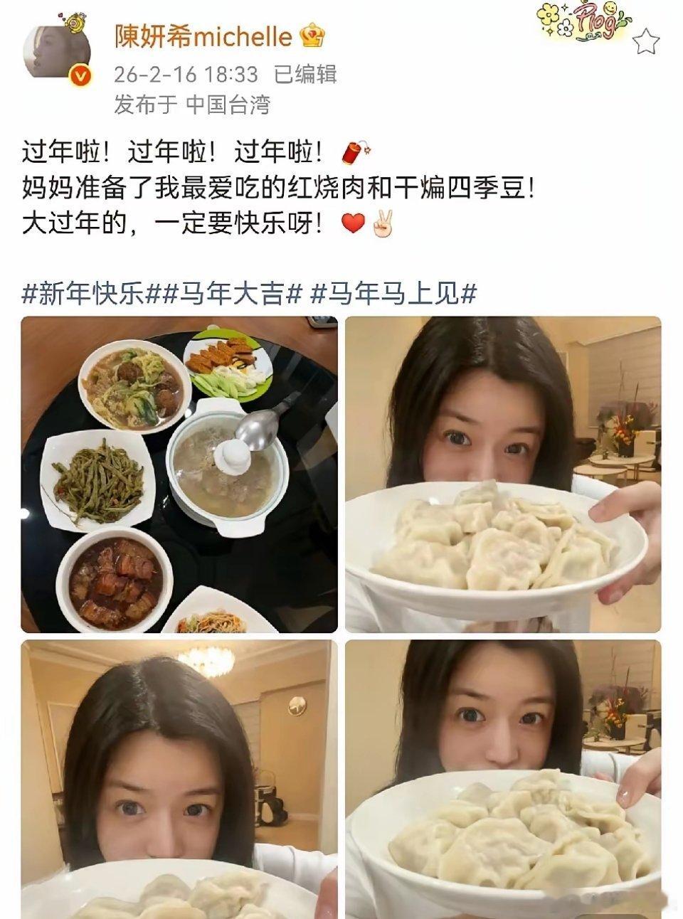 陈妍希,太激动了!2月16日,把儿子留给陈晓,独自回台湾的陈妍希,突然发文,字里行间都是激动和欢喜,配文连喊三声“过年啦”,足以可见她是真的开心。陈妍希此时的动态定位显示她身处中国台湾,餐桌上妈妈亲手做的红烧肉和干煸四季豆,正是她心心念念的家乡味,满满都是亲情的暖意。除了家乡菜,陈妍希还晒出捧着一大碗饺子的自拍,眉眼弯弯的模样十分接地气。有意思的是,今年除夕陈妍希选择独自回台陪伴家人,而儿子星星则留在了合肥,陪着爸爸陈晓一家共度佳节。这种“分头尽孝”的方式,也让不少网友感慨明星家庭的过年智慧。一边是陈妍希在台湾享受妈妈的拿手菜,一边是星星在合肥感受爸爸老家的年味,既兼顾了双方父母,也让孩子体验到了不同地域的春节氛围。由此看出,陈妍希既是个体面人,也是个聪明人。娱乐圈里多少感情撕破脸,最后两败俱伤,路人缘全败光。真走到走不下去那一步,不撕、不闹、不互相消耗,才是最清醒的选择。体面退场,护住孩子,也守住彼此最后的尊严,对谁都好。