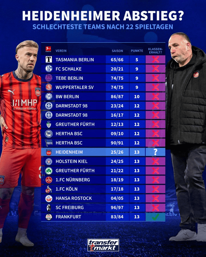 根据德国转会市场的统计,德甲历史上共出现过18支在赛季前22轮积分不超过13分的队伍,只有1983/84赛季的法兰克福最终完成保级。