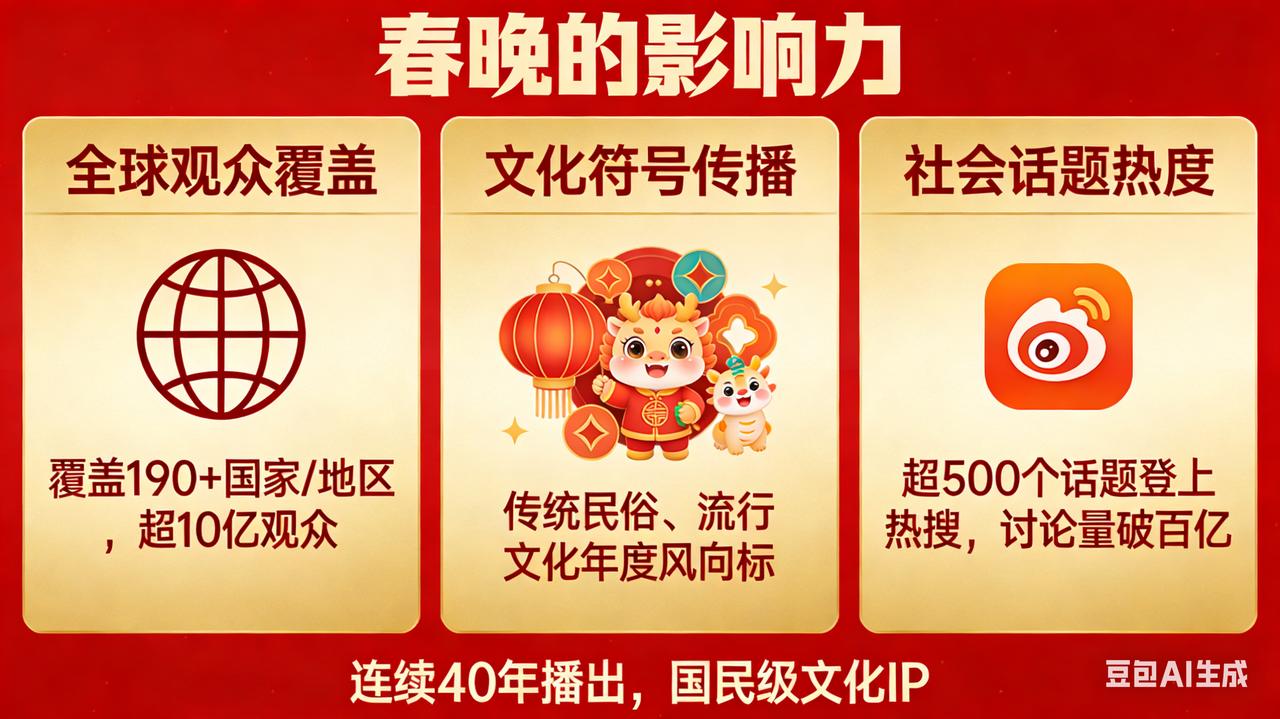 第一,情感联结的“超级纽带”作用依然不可替代。 尽管观众的娱乐选择空前多元,短视频、跨年晚会、家庭出游不断分流注意力,但春晚仍以“全家围坐”的仪式感,维系着几代人共同的情感记忆。一个节目、一句台词、甚至一个表情包,都可能在除夕夜后迅速成为全民话题,形成短暂却强烈的集体共鸣。这种跨越地域、阶层、年龄的“共时性体验”,是其他媒介形式难以复制的社会黏合剂。 第二,文化表达的“风向标”功能持续进化。 春晚不再只是传统节目的堆砌,而是主动回应时代命题。近年来,越来越多节目聚焦乡村振兴、科技创新、生态保护、青年奋斗等现实主题,用艺术化手法将国家叙事融入百姓生活。同时,非遗元素、地方戏曲、民族舞蹈的创新演绎,也让传统文化在现代舞台上焕发新生,成为文化自信的生动注脚。它不再只是“迎合大众”,更在潜移默化中“引导审美”。 第三,社会议题的“放大器”效应日益凸显。 一个关于养老的小品,可能引发全网对空巢老人的关注;一段描绘职场困境的歌舞,可能掀起对“内卷”与“躺平”的讨论。春晚以通俗易懂的方式,将敏感或沉重的社会议题带入家庭语境,促使不同代际之间展开对话。这种“软性议程设置”,往往比新闻报道更具渗透力和共情力,成为观察社会情绪的重要窗口。 第四,技术融合的“试验场”属性愈发鲜明。 从4K/8K超高清、AR/VR沉浸式舞台,到AI生成内容、虚拟主持人,春晚始终是新技术应用的前沿阵地。它不仅提升观赏体验,更推动着媒体融合与产业升级。例如,通过“竖屏直播”“互动红包”“跨屏联欢”等模式,春晚正尝试打破单向传播的壁垒,构建更具参与感的新型观演关系,探索传统媒体在数字时代的转型路径。 因此,春晚的影响力,已从“看不看”的娱乐选择,演变为“如何看”的文化现象。它不再追求覆盖所有人群,而是在多元声音中寻找最大公约数,在守正创新中延续文化生命力。它的真正价值,或许不在于每年产出多少“爆款”,而在于它始终存在——作为一个象征,提醒我们:无论时代如何变化,总有一些时刻,值得我们停下脚步,共同凝视,一起感受这个时代的呼吸与脉动。