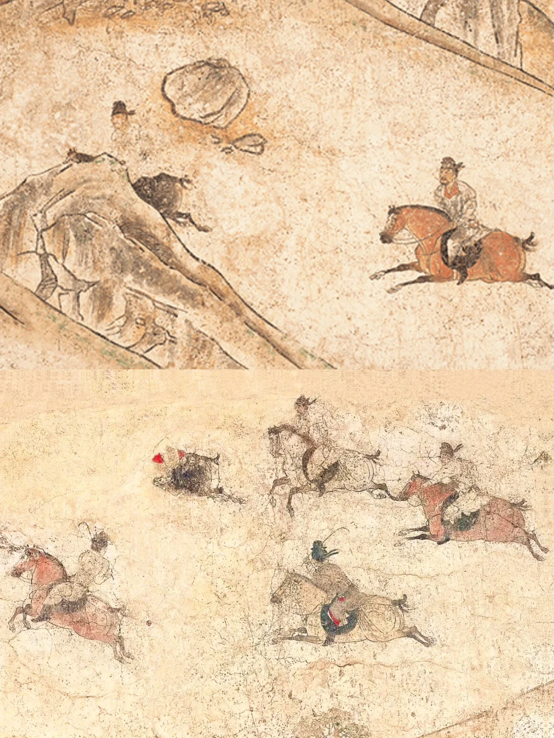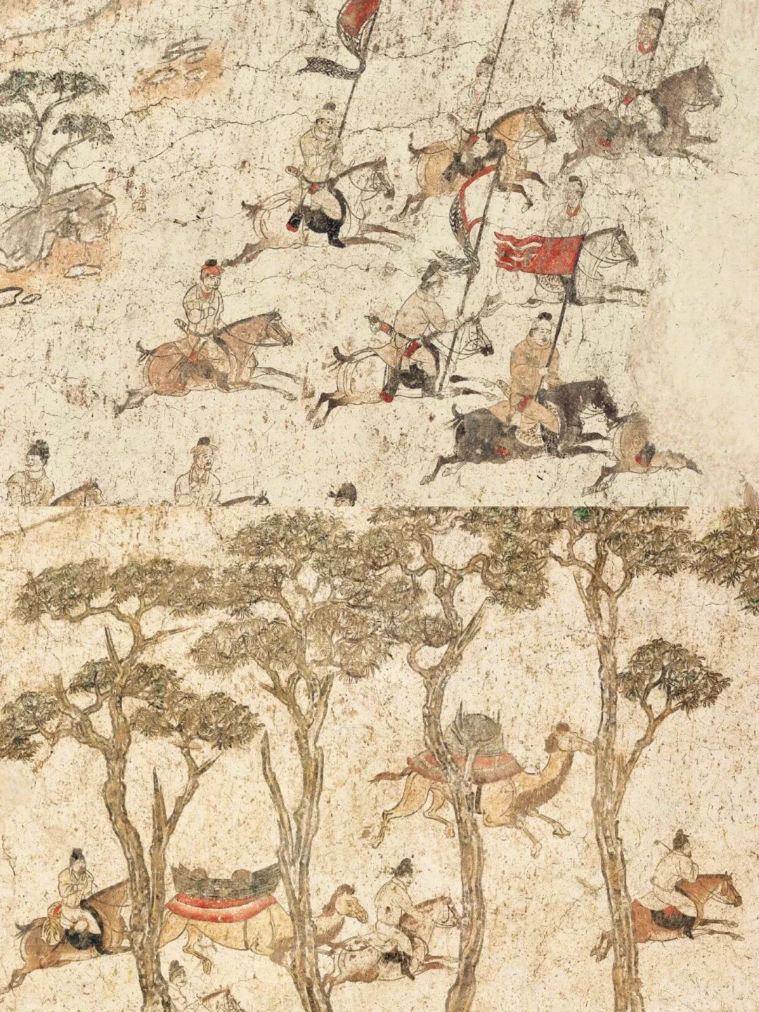 同出李贤墓,现藏陕西历史博物馆。长卷绘贵族骑马狩猎的宏大场面,人马、犬鹰动态鲜活。