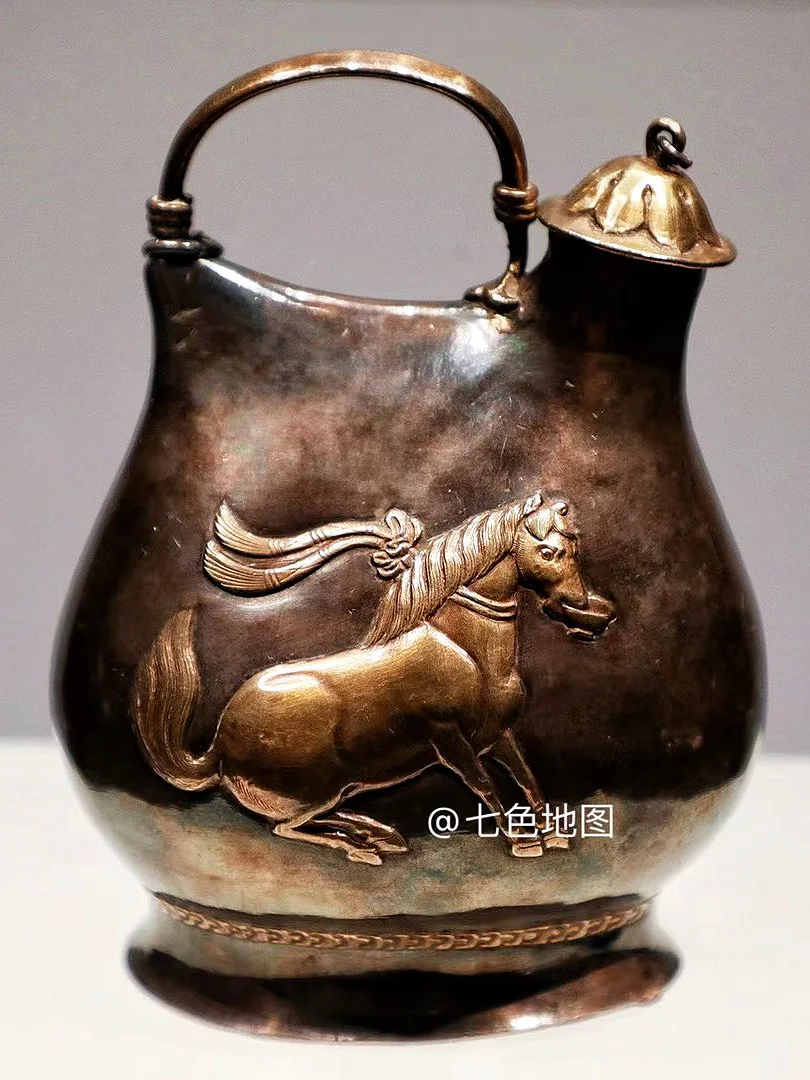 现藏陕西历史博物馆。壶身刻唐玄宗时期舞马祝寿的宫廷场景。