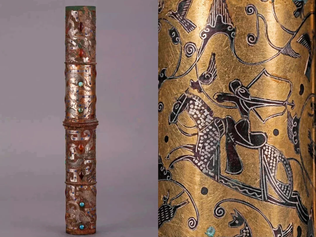 4.西汉 错金银镶松石狩猎纹铜伞铤