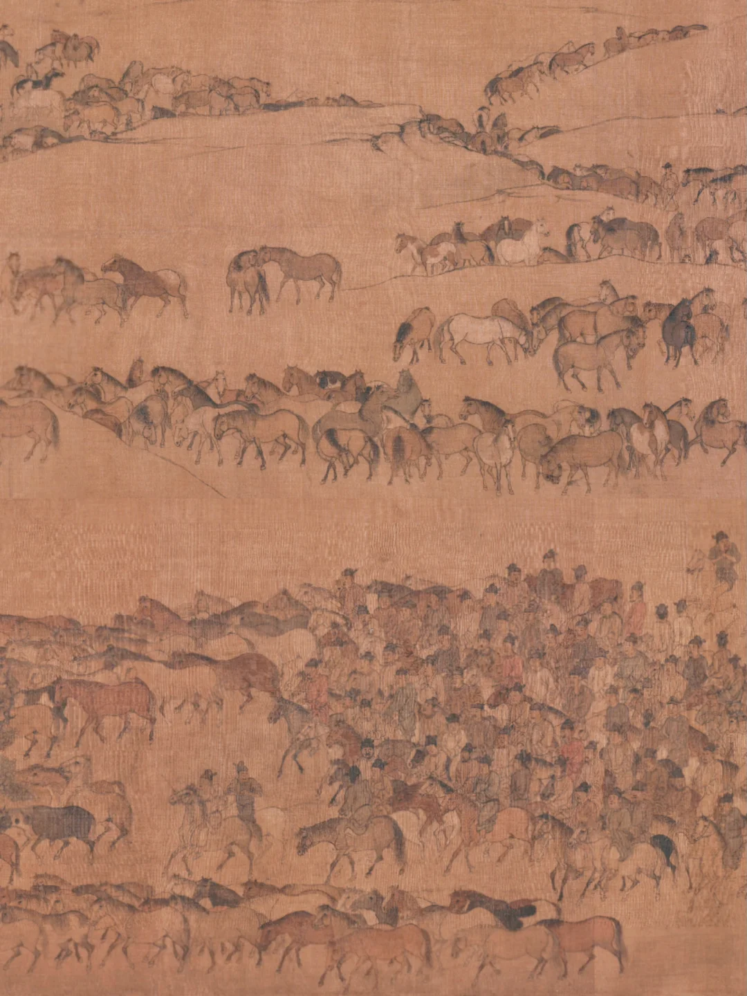 李公麟画作,北京故宫博物院藏。全卷1286匹马,展现皇家牧场从出牧到散牧完整过程,马姿各异,“千马千面”。