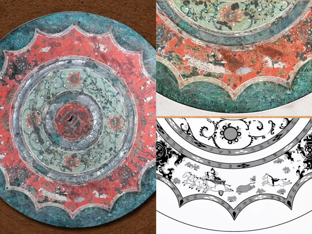 现藏西安博物院。镜背以罕见彩绘呈现车马人物,填补汉代彩绘铜镜工艺空白。