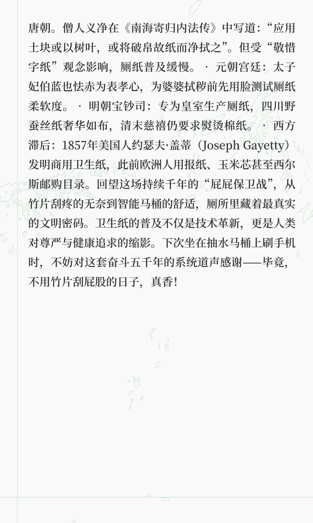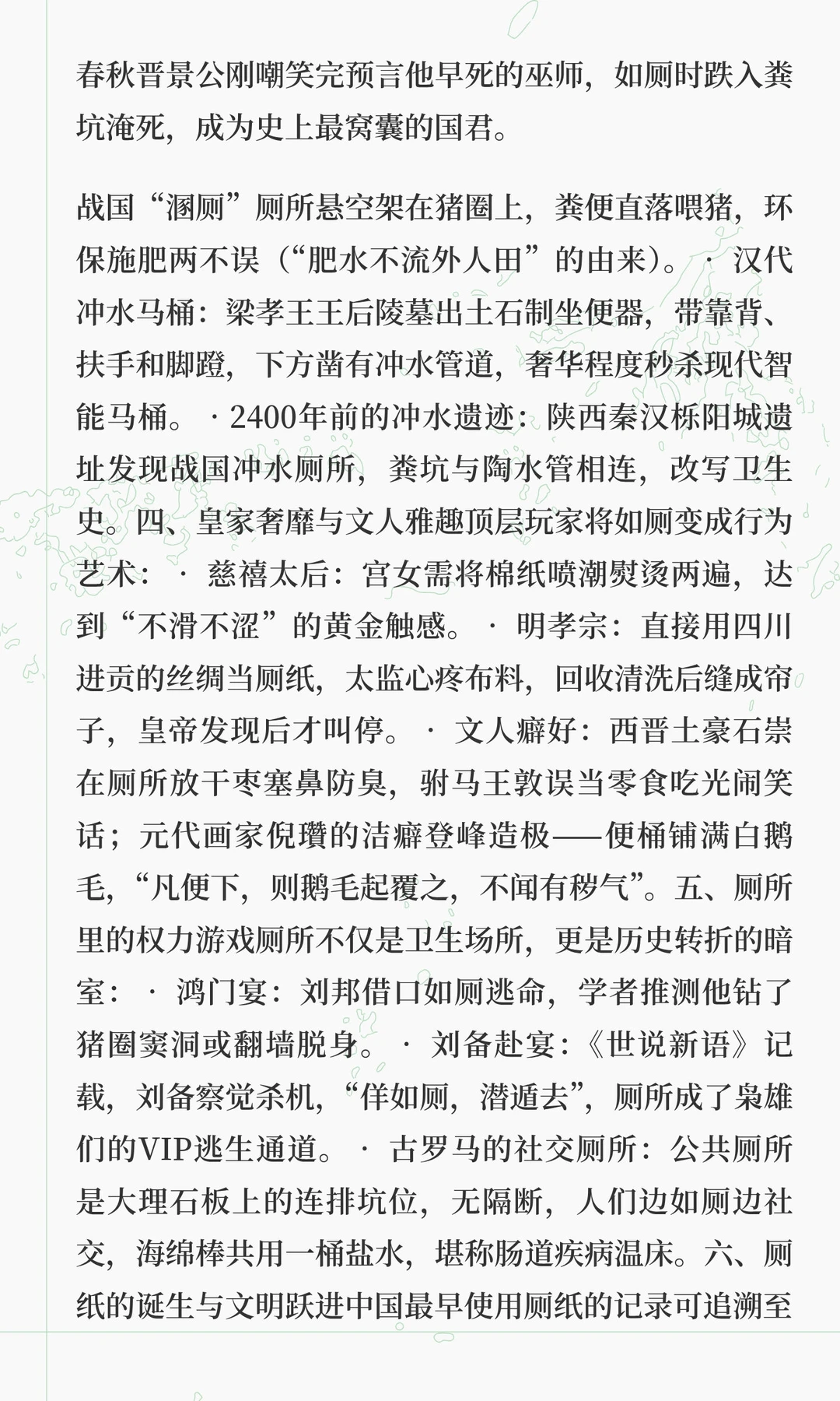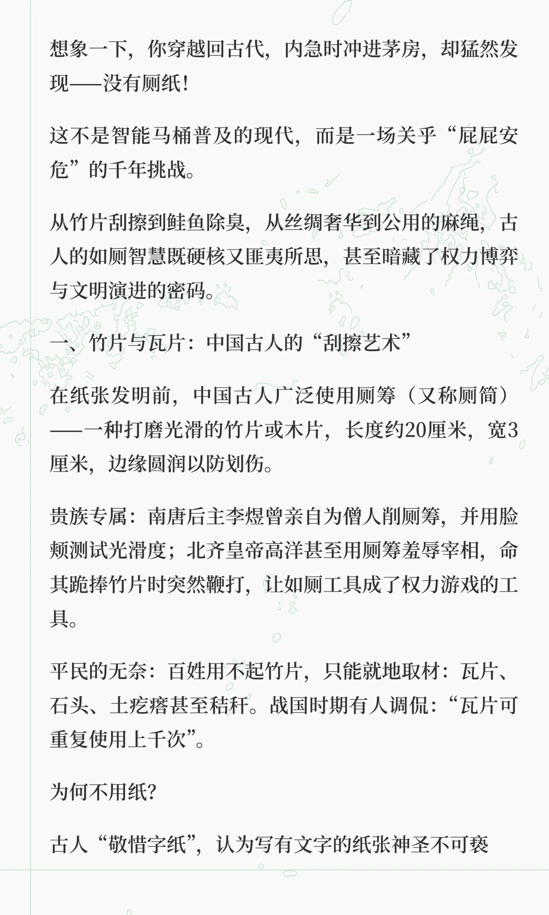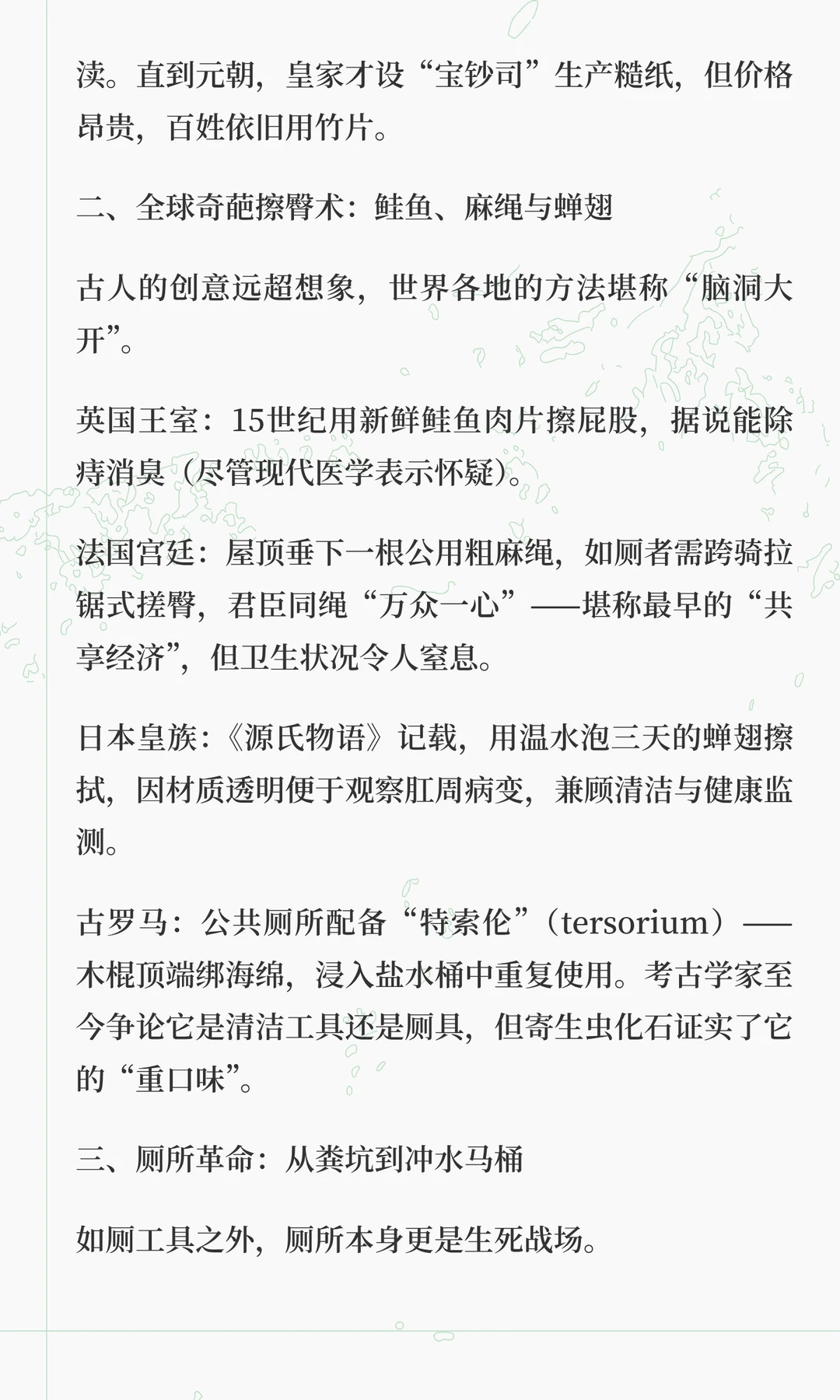 从竹片刮擦到智能马桶,古人的如厕智慧展现了文明演进的密码。从皇家鲑鱼擦臀到平民公用麻绳,再到现代智能技术,厕所不仅是卫生工具,更是权力博弈、文明进步的象征。