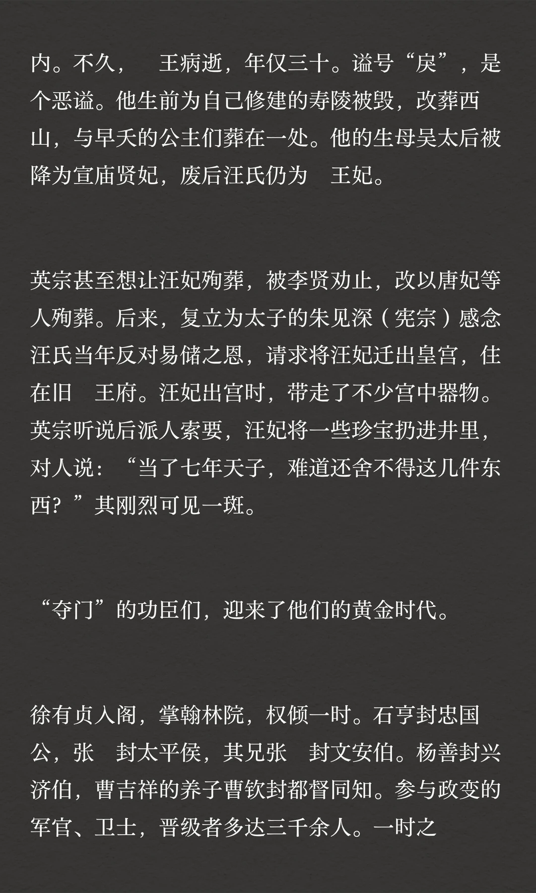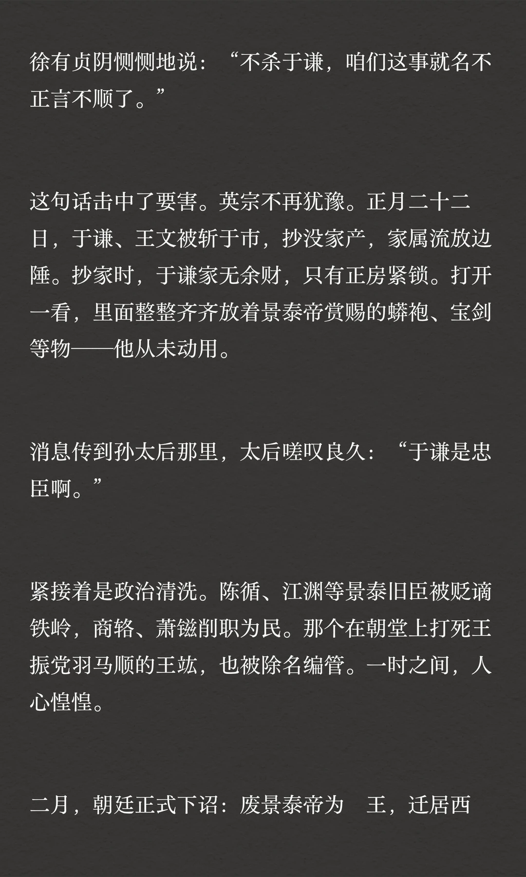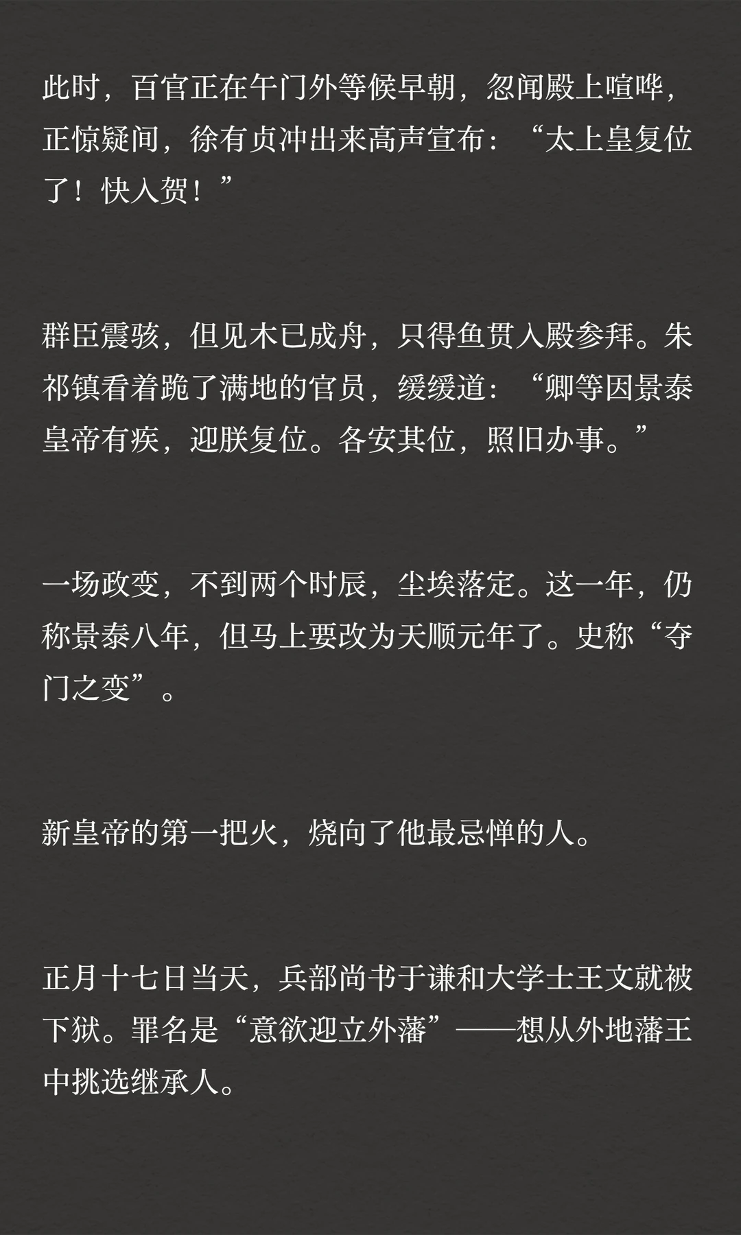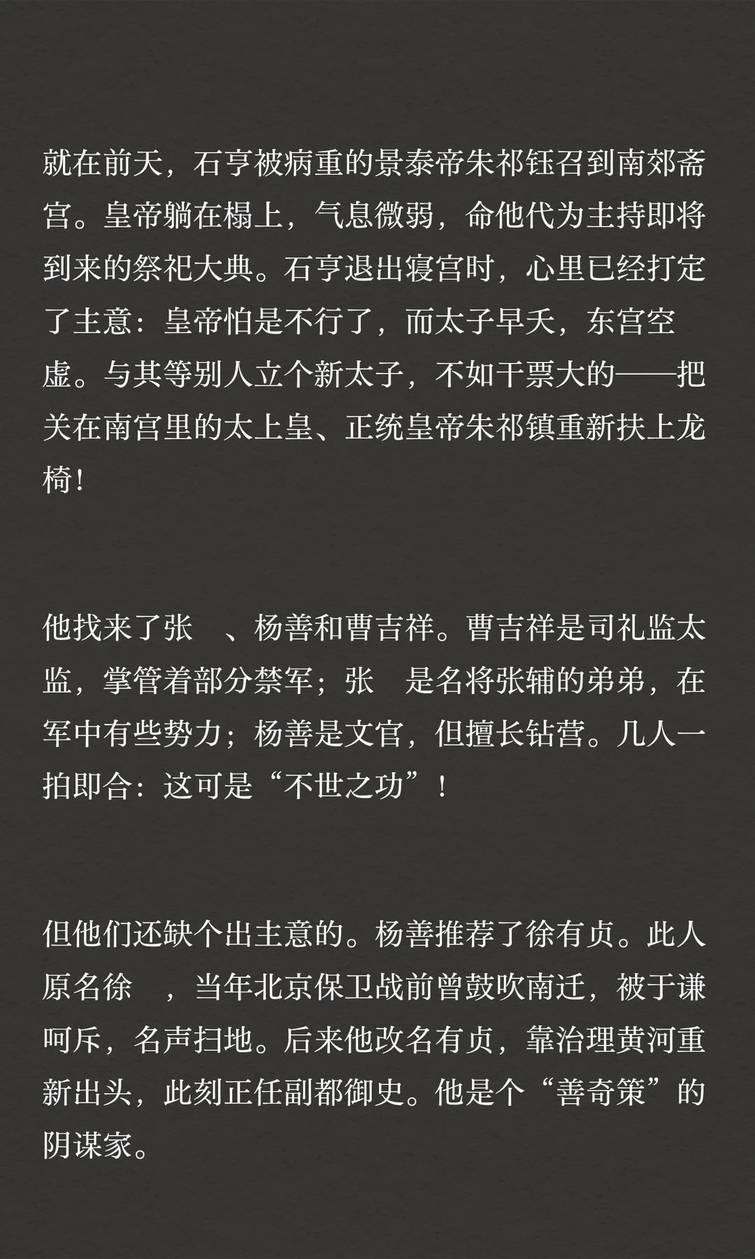 正月十七日,武清侯石亨等人发动“夺门之变”,复辟太上皇朱祁镇,废黜景泰帝。徐有贞策划政变,石亨等功臣借此崛起,但英宗英明,最终平定叛乱,于谦冤案未得平反,政变功臣纷纷落马。