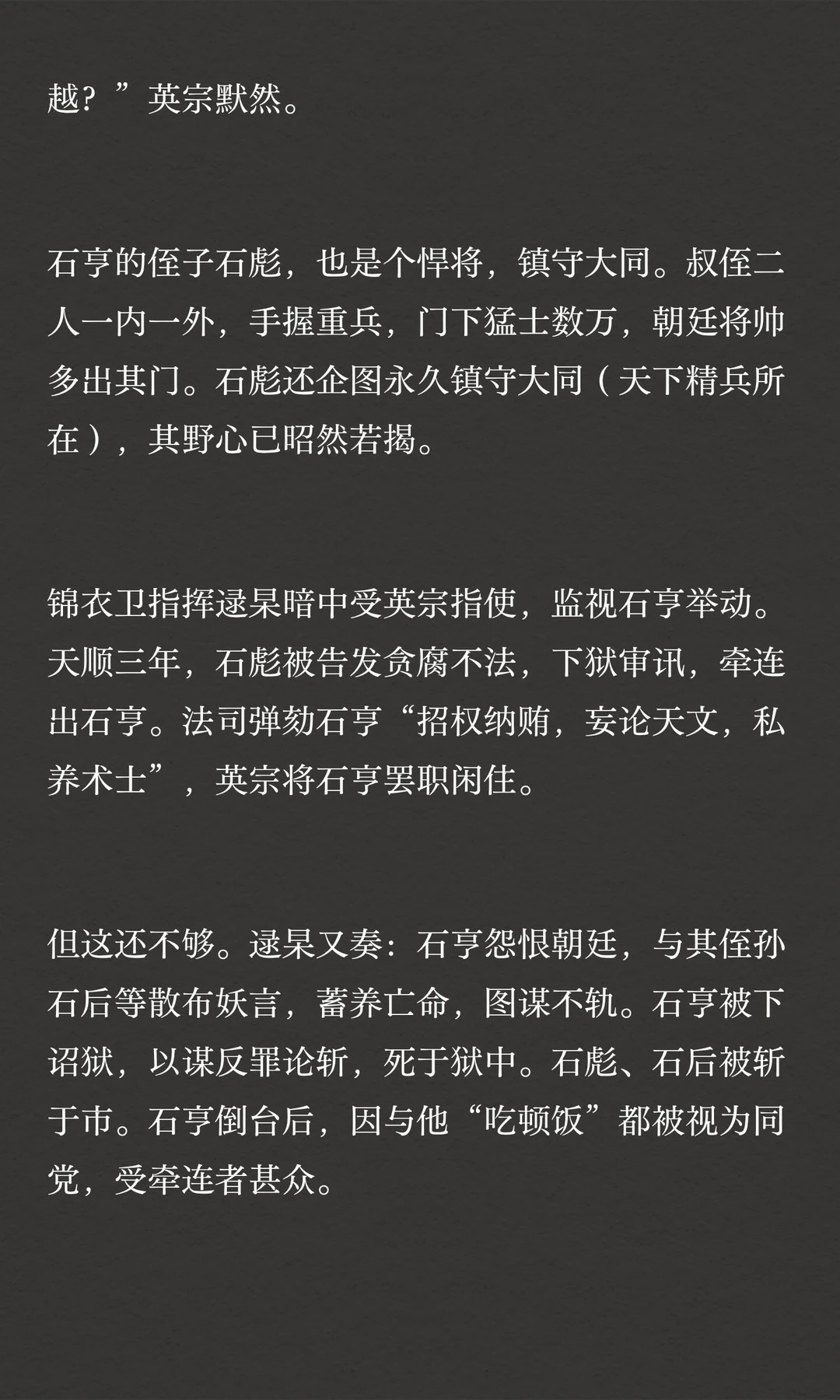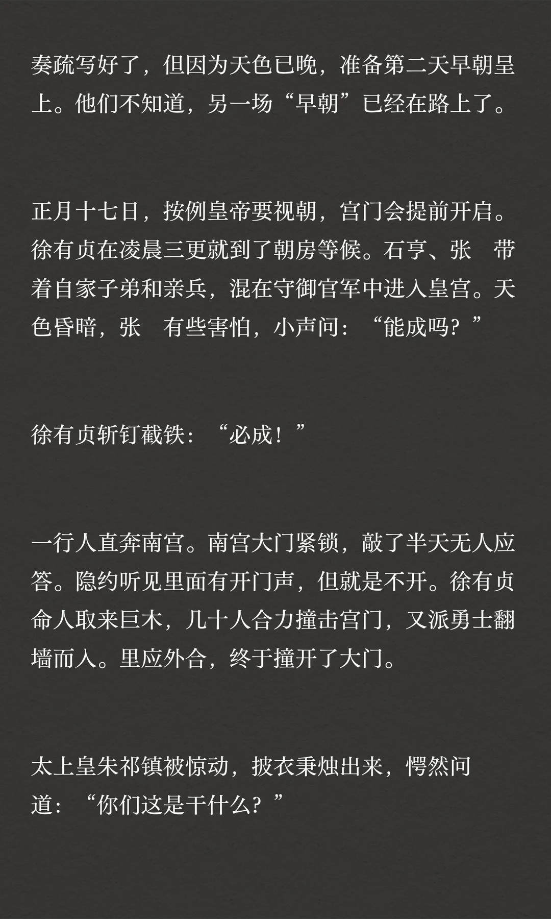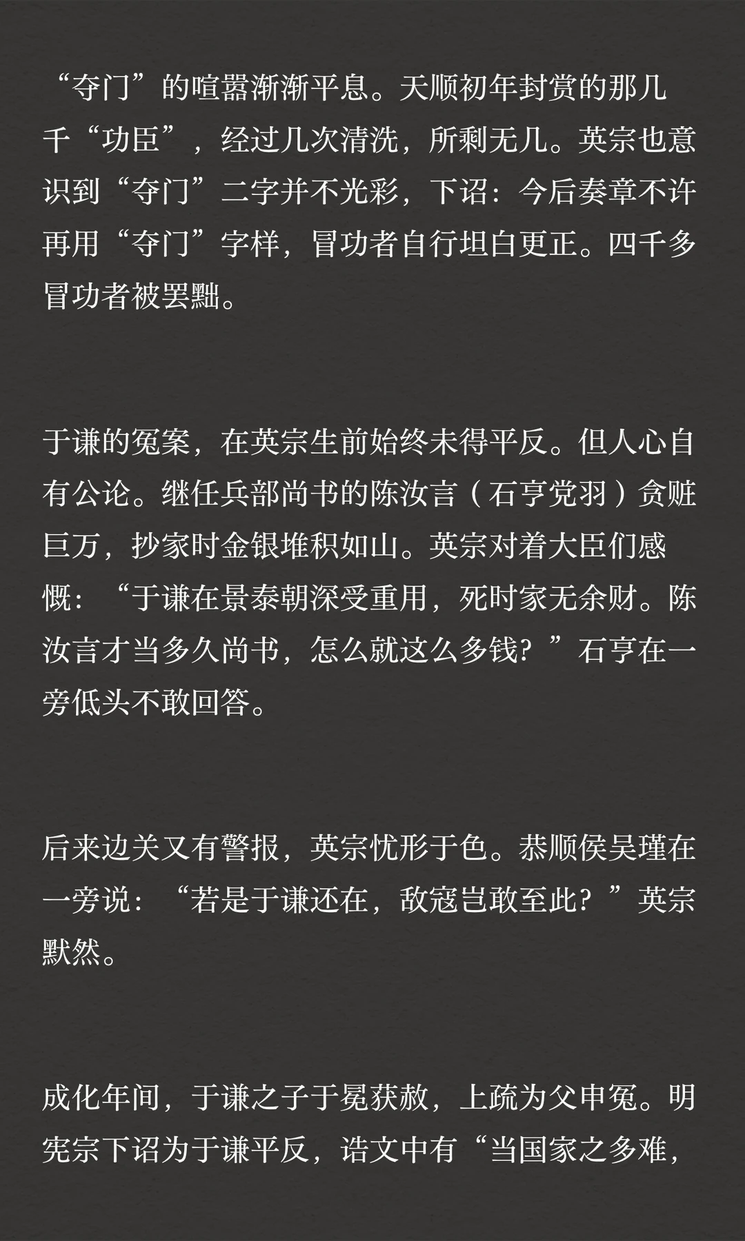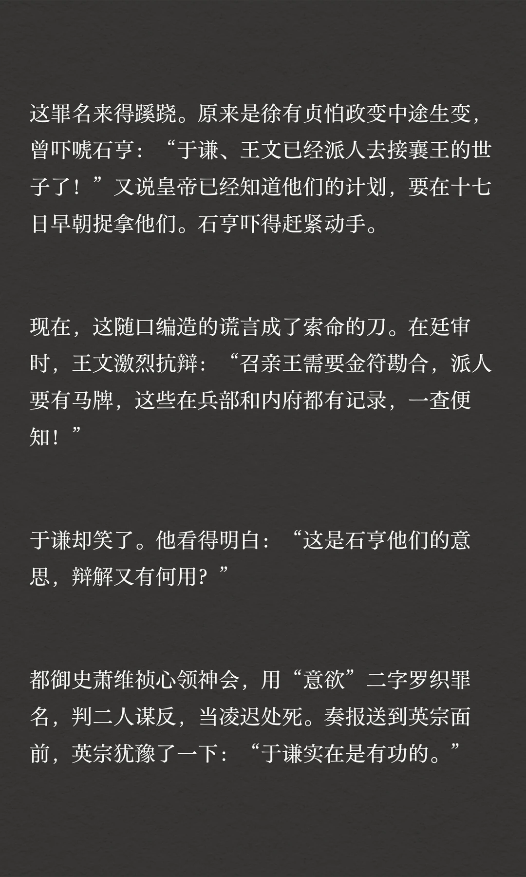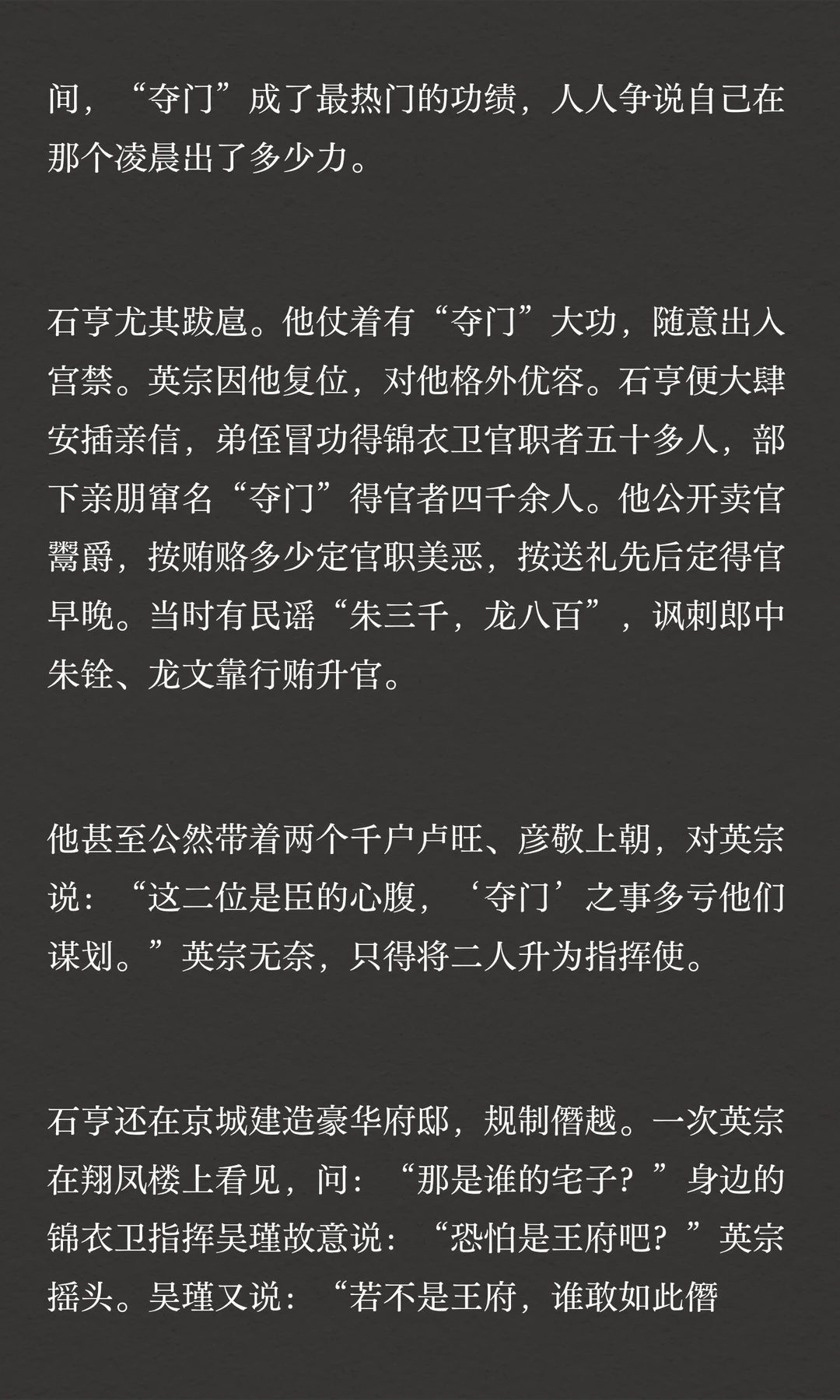 正月十七日,武清侯石亨等人发动“夺门之变”,复辟太上皇朱祁镇,废黜景泰帝。徐有贞策划政变,石亨等功臣借此崛起,但英宗英明,最终平定叛乱,于谦冤案未得平反,政变功臣纷纷落马。