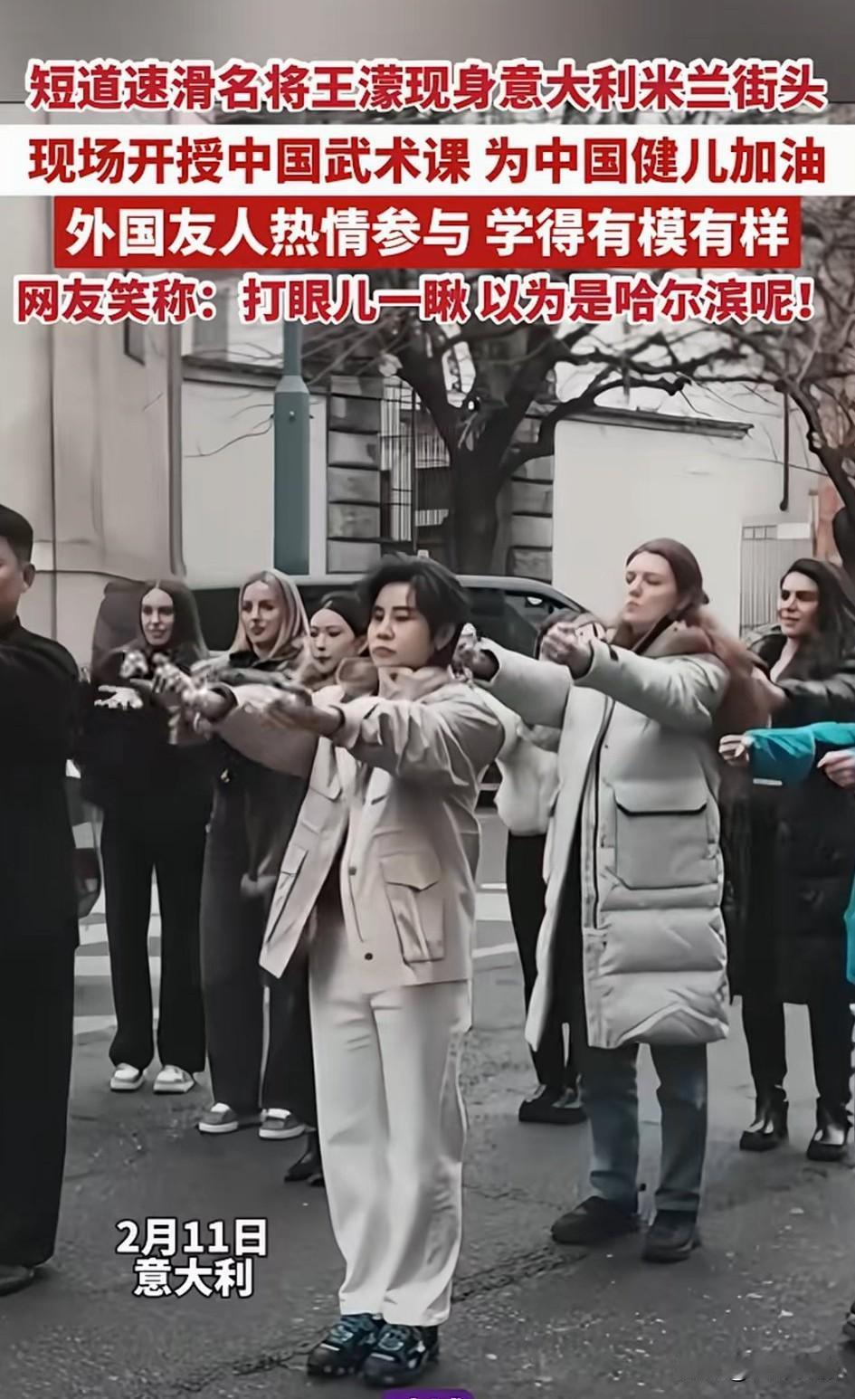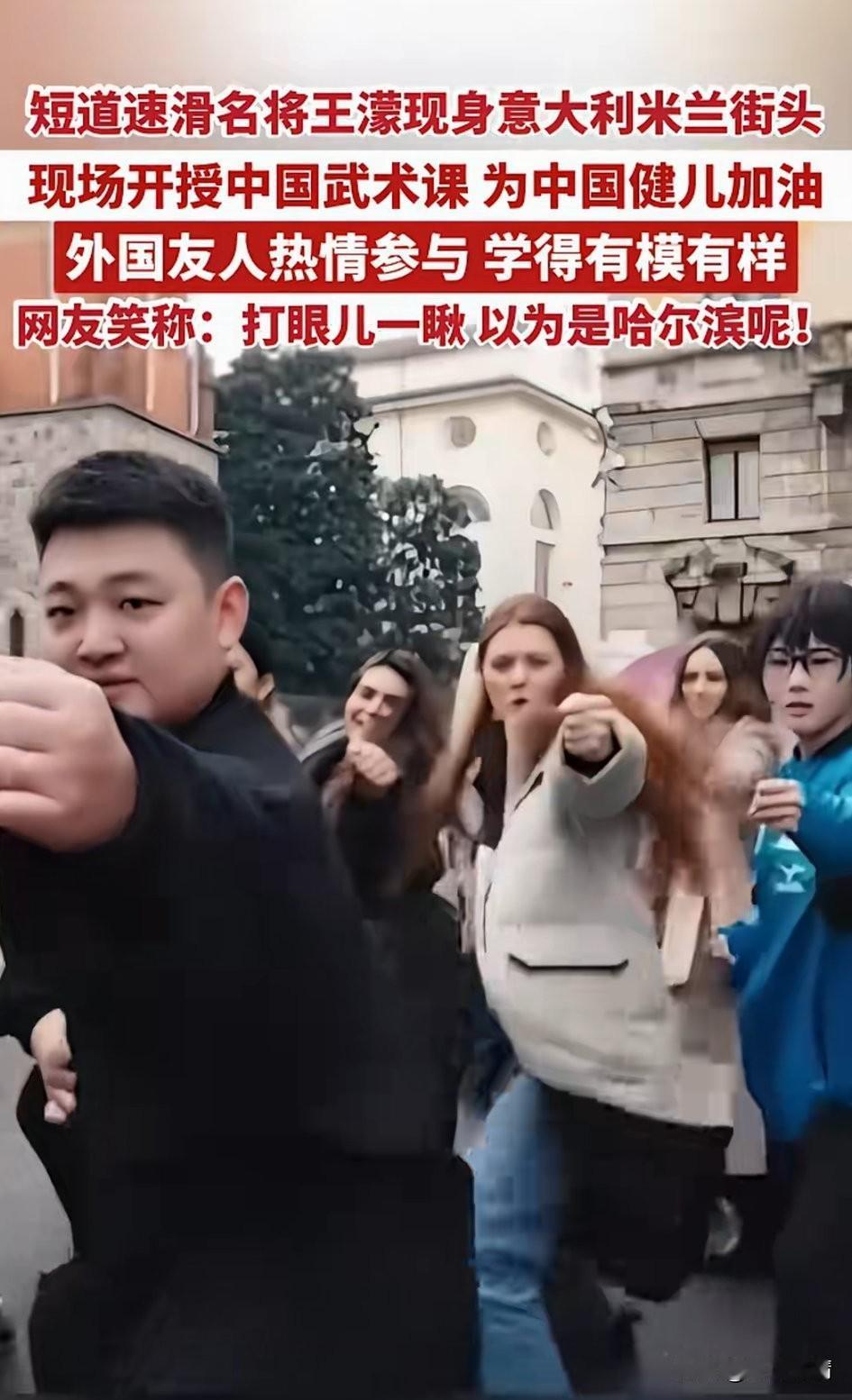 短道速滑名将王濛现身意大利米兰, 在大街上开始教自己的粉丝练习中国功夫,一板一眼打的非常认真, 看着周围的建筑,还以为在哈尔滨,要不是周围老外比较多,还真的以为他们在国内! 他们的表演吸引了周围很多老外,他们都以为中国人都会武功,这下真的是瞒不住了! 这就是中华文化的魅力,大家都非常喜欢中国武功,觉得武功比较神秘,短道速滑名将也把中国功夫带给了世界! 大家对于王濛在意大利米兰街头练习中国功夫这事怎么看?