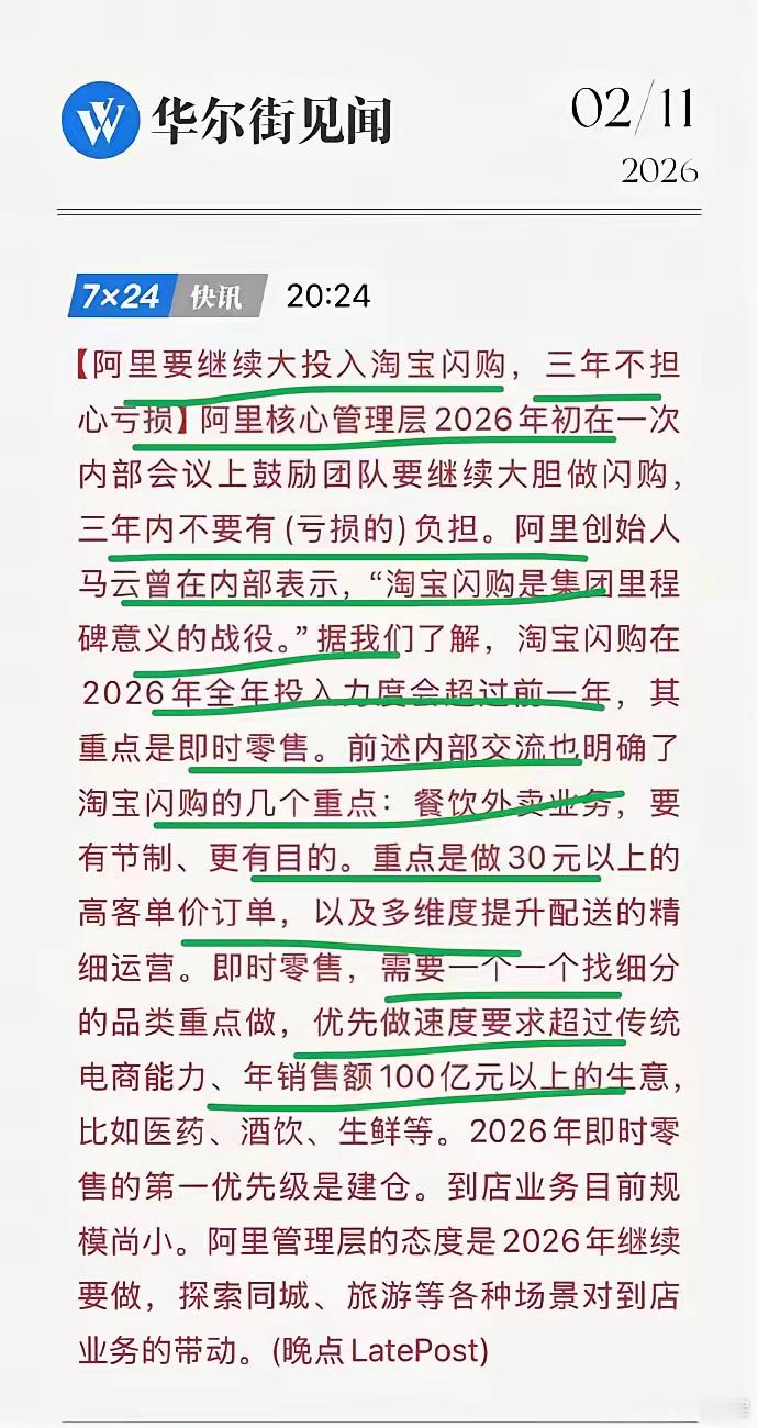 淘宝闪购是阿里近年最漂亮的一次反击战!令某团万万没想到是,常年被压制的对手,还有咸鱼翻身的一天?但,阿里的太子蒋凡做到了,他一上任,令人非常意外的是,不是向对手拼夕夕发动进攻,而是大刀砍向了某团!!王总当年大赞这两个最聪明的年轻人,认为蒋凡打赢对拼夕夕的一战就能成为阿里当之无愧的新接班人,新领袖~不过,令王总万万没想到的是,这个最聪明的年轻人一上台,就向他发起了进攻,给了他当头一棒~现在的淘宝闪购,加上搅局的京东,让某团市场份额尽失,大幅亏损,2024还盈利358亿,而去年亏了243亿,就问你吓不吓人?某团只能跑去搞海外市场谋取一些新的增长点?问题是国内打不过,靠国外能行吗?这是一个问题!!问题该还大着呢?阿里高层和马老师对这次战役非常满意,鼓励团队大胆去做,不要担心亏损,有钱!2026,会继续大力度投入,肯定超过2025的投入力度,谁说外卖大战要结束了,这不才刚刚开始嘛,接下来,某团和王总要如何应对呢?我还有一个问题,百思不得其解,为何一家平台企业,动不动一年能亏上几百亿,怎么做到的,钱又去了哪里?有大神出来科普一下么??