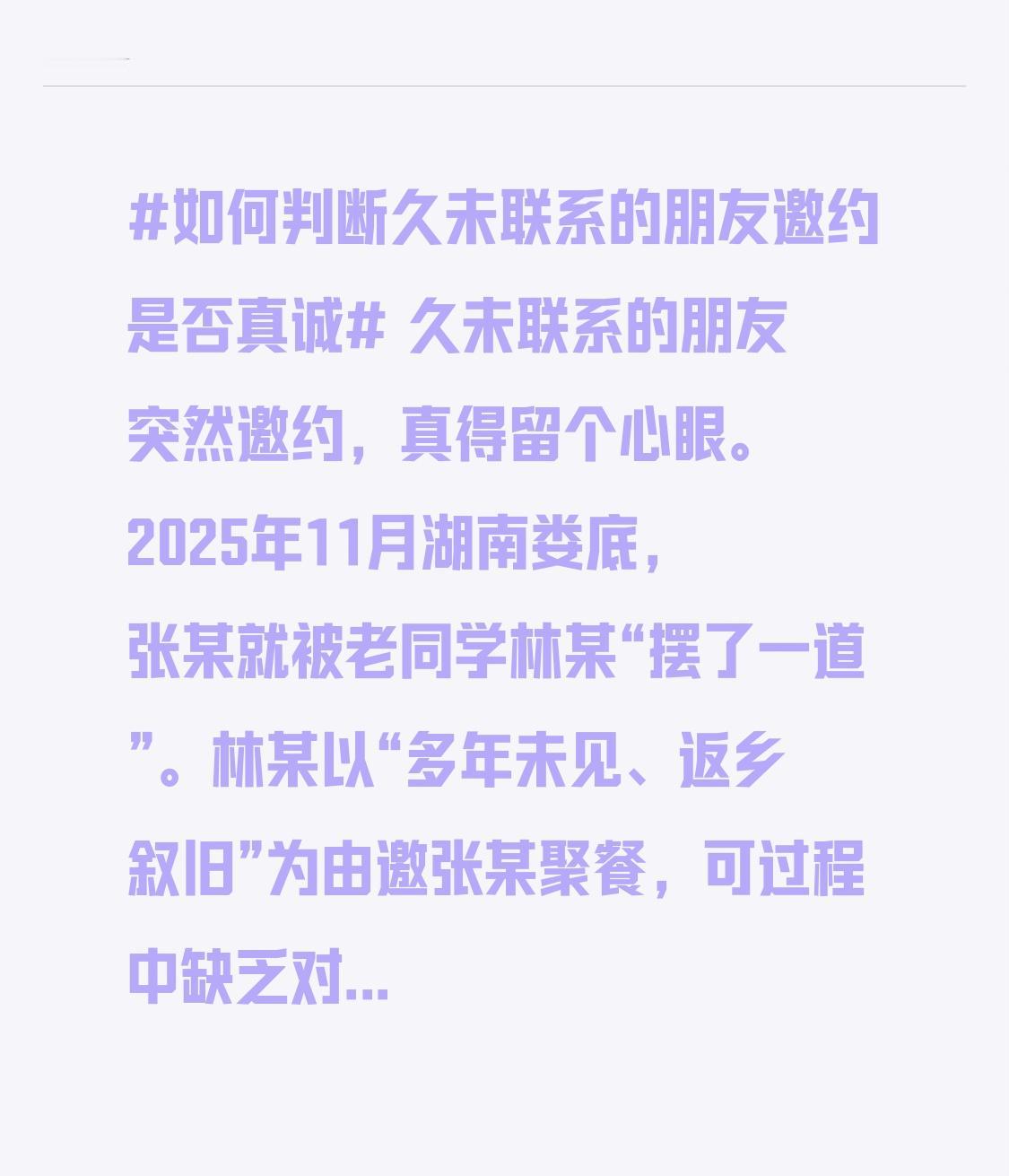 久未联系的朋友突然邀约,真得留个心眼。2025年11月湖南娄底,张某就被老同学林某“摆了一道”。林某以“多年未见、返乡叙旧”为由邀张某聚餐,可过程中缺乏对过往生活的自然交流,更像“任务式召唤”。 真诚的邀约一般有情感铺垫和具体细节,比如会提及具体时间、地点或共同回忆。而假客套常用“改天聚聚”这种模糊说法。要是对方长期失联后突然热络,却对近况含糊其辞,邀约还回避细节,那可得小心了。真心想重聚的人会主动跟进,虚假邀约往往说完就没下文。可以线上试探,若对方总催见面、拒绝透露聚会信息,话题还转向投资,那大概率有问题。