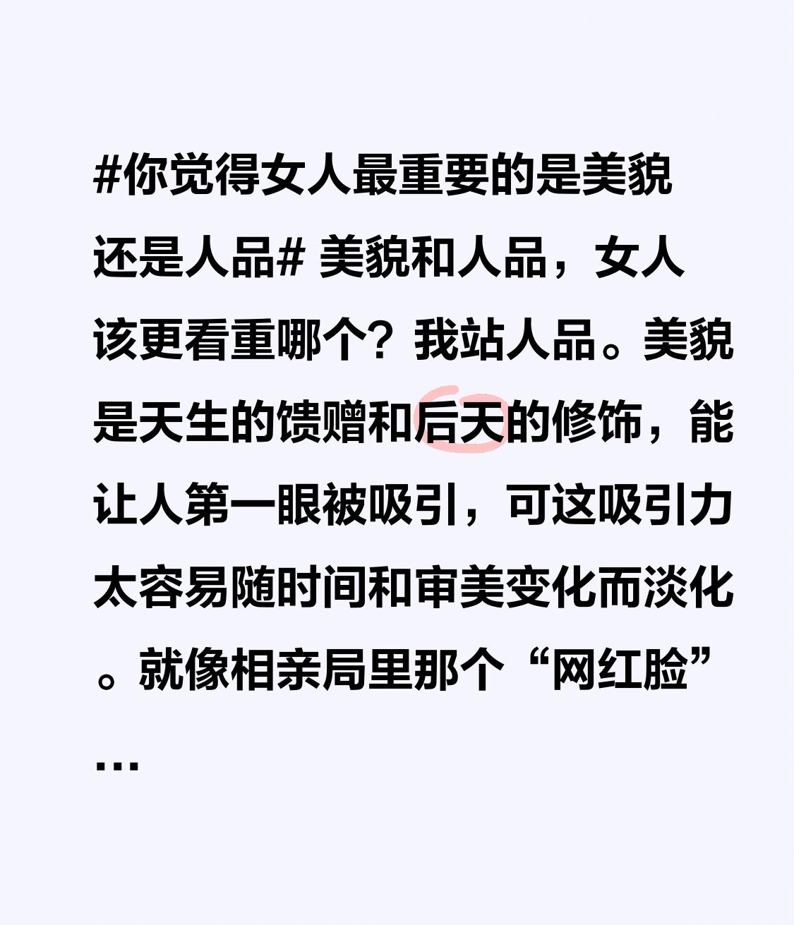 美貌和人品,女人该更看重哪个?我站人品。美貌是天生的馈赠和后天的修饰,能让人第一眼被吸引,可这吸引力太容易随时间和审美变化而淡化。就像相亲局里那个“网红脸”女生,美则美矣,服务员洒点水就破口大骂,美貌瞬间变得面目可憎。 而人品是内在根基,藏着善良、真诚等特质。朋友的未婚妻相貌平平,却在他生病时默默送药,遇事积极解决。和这样的人在一起,日子才有奔头。在滤镜时代,美貌贬值,靠谱善良的人品才是稀缺品。聪明女人,修脸更要修心。